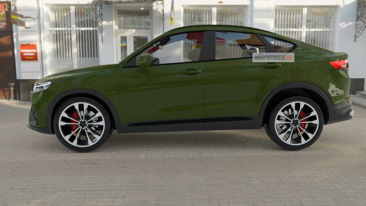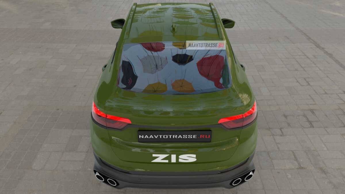 Задняя часть кузова у российской новинки закрепляет образ спортивного кроссовера. Здесь разработчик установил крупное стекло, что не характерно для многих купеобразных автомобилей. На корме просматривается спойлер, который слегка выступает над крупными светодиодными фонарями. Задний бампер закрыт пластиковой накладкой, в которой встроены сразу 4 выхлопных трубы. Но 3 них, вероятно, носят декоративный характер: кроссовер получится маломощным.