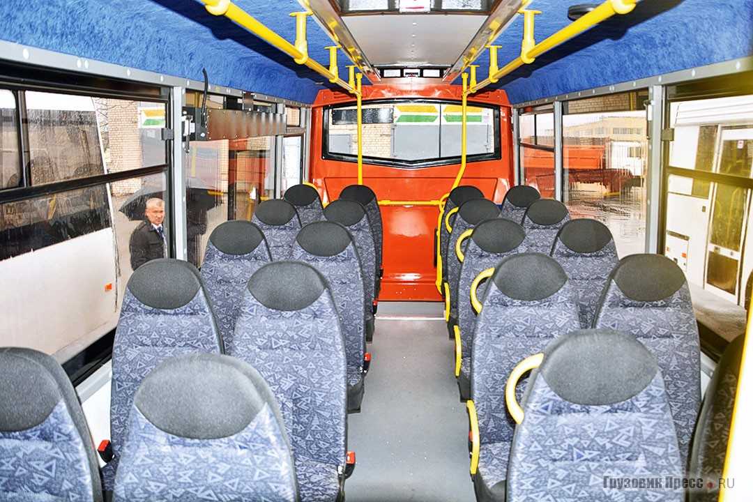 Интерьер. Салон спроектирован с учетом всех современных требований к пассажирскому транспорту. Количество сидений класса люкс — 28, при необходимости дополнительно устанавливается сиденье гида. Эргономичное место водителя с регулировками позволяет управлять автобусом с максимальным комфортом.