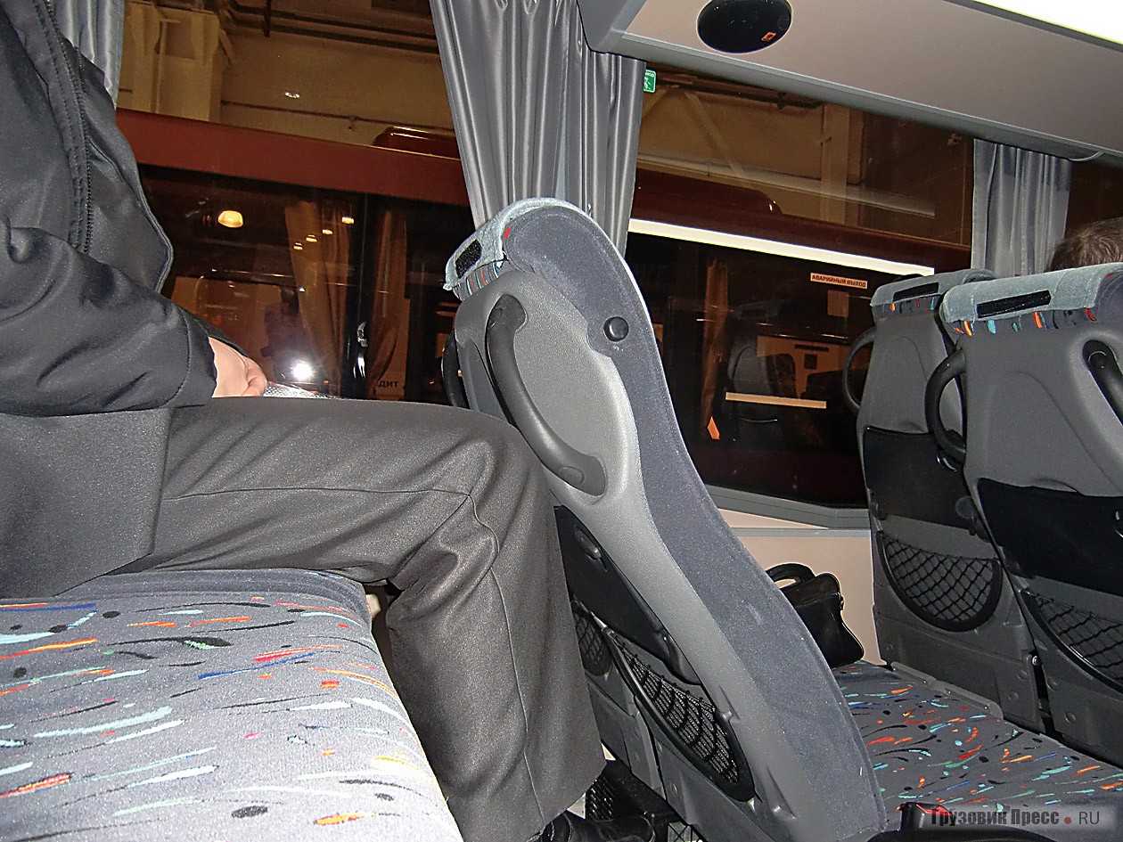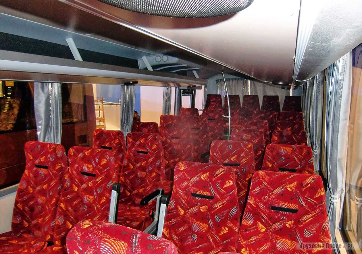 Основное – это, конечно, салон. Комфортабельные кресла с откидной спинкой оснащены двухточечными ремнями безопасности. Все они стоят просто на полу, без каких-либо подиумов, тем самым облегчая процесс перемещения по салону. Отсутствие индивидуальных блоков освещения компенсируется довольно ярким общим светом, размещённым в багажных полках, а днём дополнительный свет проникает сквозь прозрачные аварийные люки в крыше автобуса. Вместо персональных воздуховодов в центре салона установлен кондиционер. Грамотное размещение позволяет распределять воздух по салону, не допуская ледяные струи к головам пассажиров. Пульт управления климатической установкой прекрасно уместился над головой водителя. Само собой автобус, рассчитанный на междугородные перевозки, оснащён видеосистемой в потолочном выступе над ветровым стеклом и багажным отсеком. Последний сделан именно таким, чтобы в случае необходимости забросить в него пару габаритных сумок, но при этом он не отнимает пространство у салона.