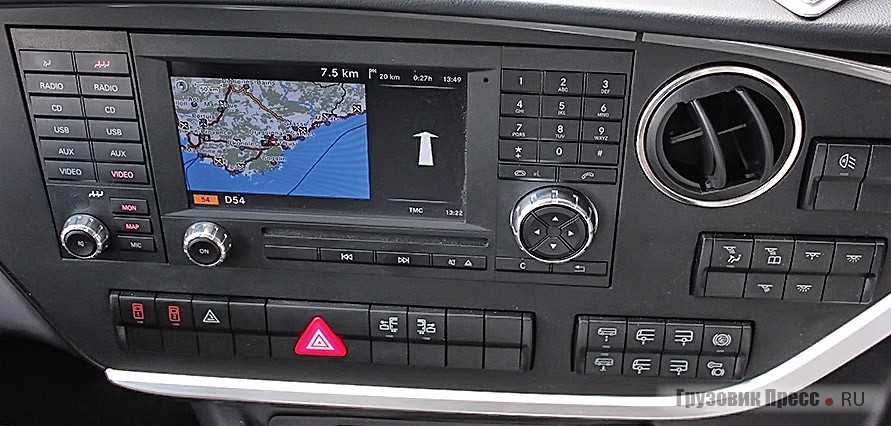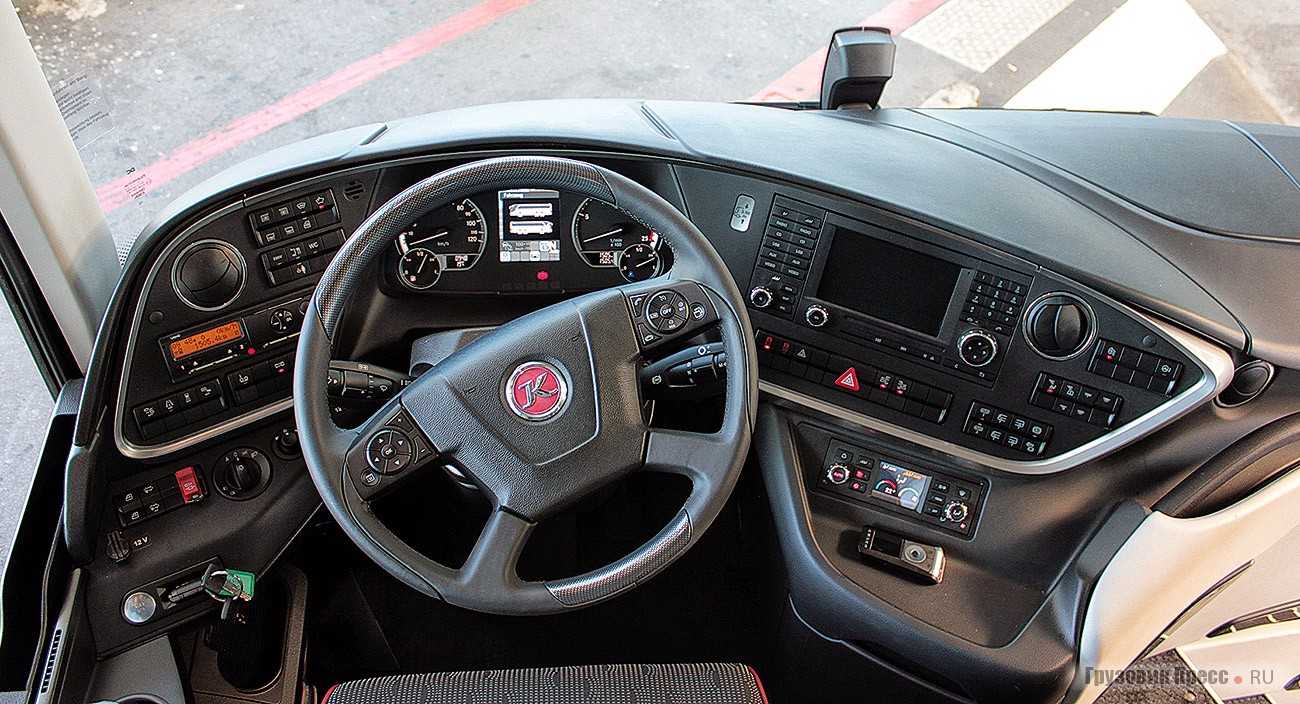 Сиденье водителя удобное, приборная панель не бликует, шторка на окне с электроприводом. Электронных приборов и систем на борту, как на космическом шаттле, в частности, темпомат с системой контроля заданной дистанции до впереди идущего транспорта в попутном направлении, — ART; электронное управление тормозной системой EBS, ассистент экстренного торможения ABA, ограничитель скорости при длительном торможении DBL, электронная система стабилизации движения ESP.