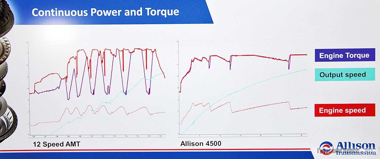 Второе – в принципе, автоматическая гидромеханическая трансмиссия, единственная, которая обеспечивает непрерывный поток мощности от двигателя к ведущим колёсам. А в арсенале компании Allison имеется плюс ко всему свой запатентованный гидротрансформатор со встроенным демпфером крутильных колебаний, и всё это позволяет использовать двигатели меньшей мощности, чем при традиционном конструктиве, вот, оказывается, как! Это называется технология Continuous Power Technology, взгляните на диаграмму. Убедительно, но для ещё большей достоверности меня пригласили за руль.