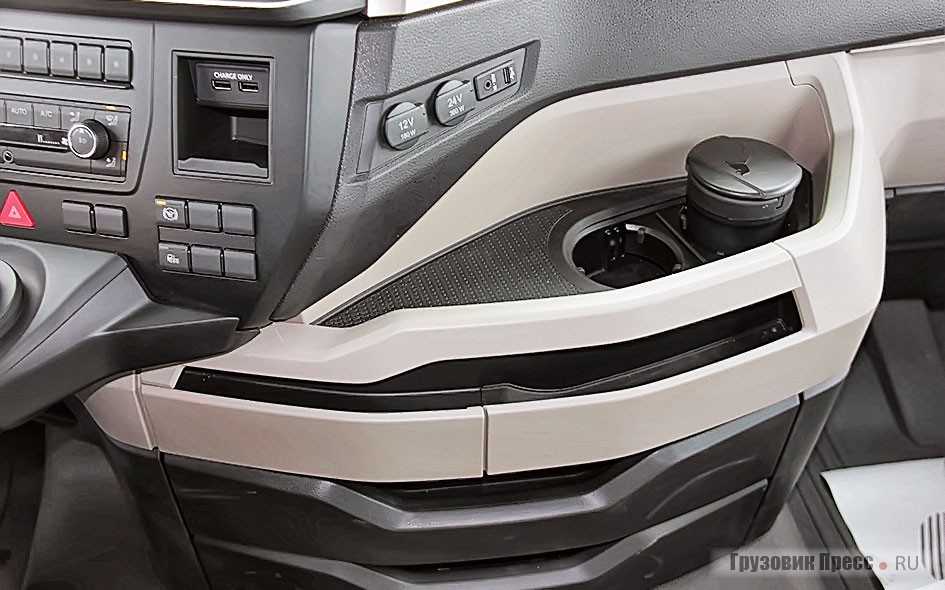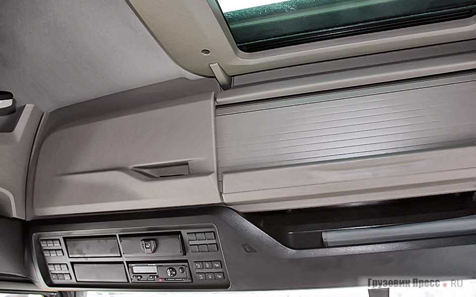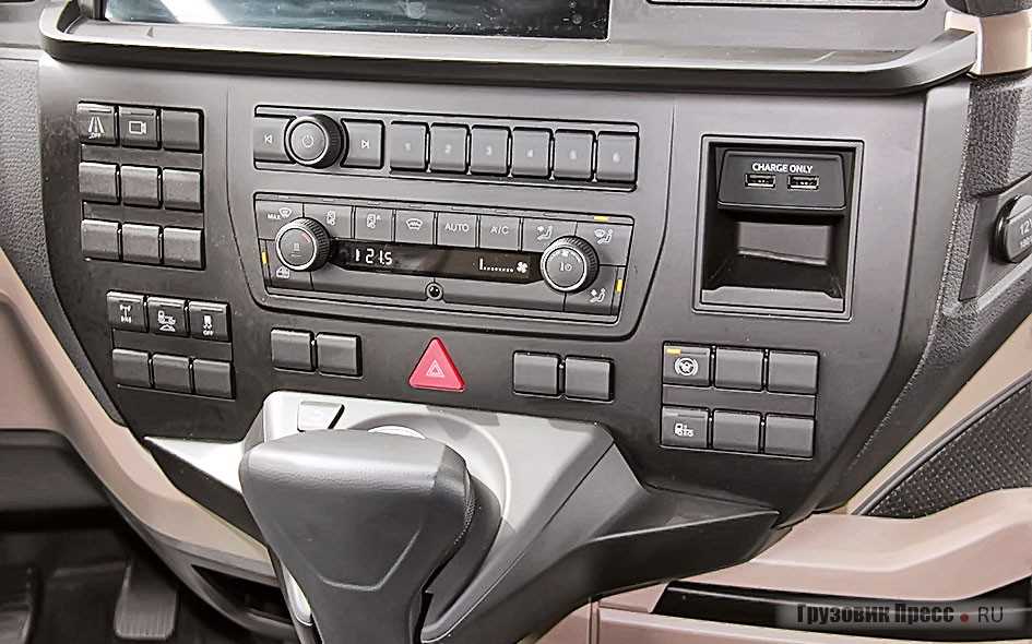 Передняя панель существенно изменилась в сравнении с предыдущим поколением машин TGA. Кармашков, ящиков и ниш для хранения вещей стало больше, над моторным тоннелем расположена широкая выдвижная полка для мелочей. Появился даже отдельный бокс для хранения солнцезащитных очков. Блок приборов тоже доработали. На экран жидкокристаллического дисплея выводится информация русифицированного бортового компьютера. Управление компьютером вынесено на рулевое колесо, но к навигации необходимо привыкнуть, так как водителю придется «общаться» с десятью (!!!) клавишами, что вначале несколько озадачивает. Показания других приборов читаются великолепно, шкалы подсвечены в любых режимах, даже при выключенном свете фар.