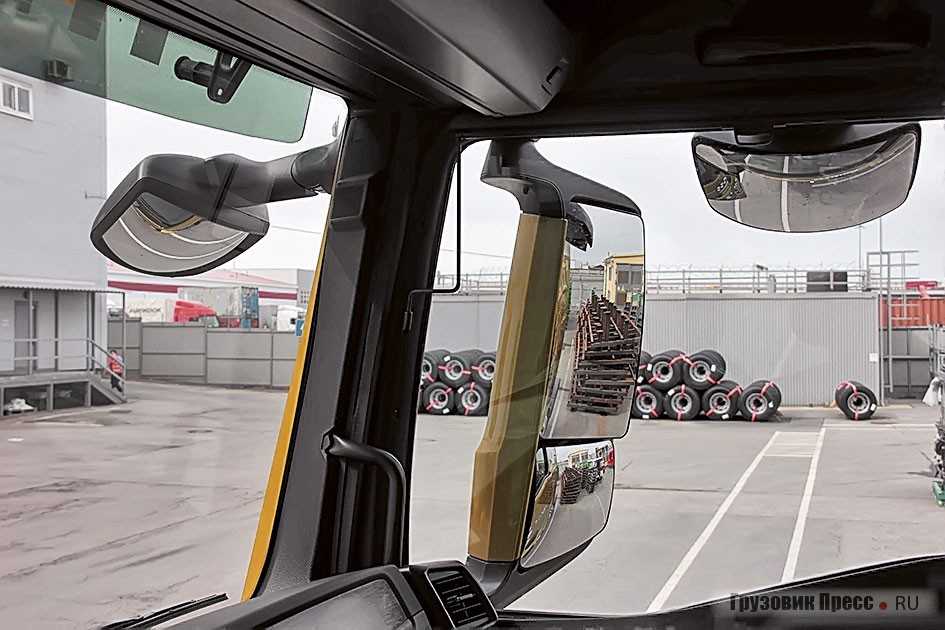Однако при любом положении кресла обзорность с места водителя можно назвать безупречной. Огромная площадь остекления, в сочетании с грамотно настроенными гирляндами зеркал позволяют свободно контролировать габариты автопоезда. Если ещё добавить дополнительное сферическое зеркало со стороны водителя – обзор назад и вовсе становится абсолютно идеальным.