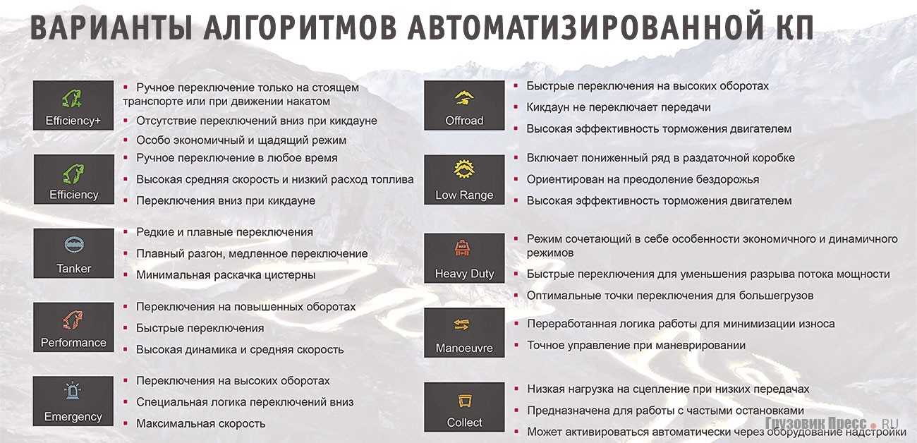 Трансмиссия грузовика может быть, как механической, так и автоматической. Во втором случае, КПП обладает двумя функциональными режимами, выбираемыми по предпочтениям водителя. При работе на автоматическом режиме система обеспечивает автоматическое переключение передач, когда режим полуавтомат, позволяет переключать передачи вручную, но без выжима сцепления. Интересной особенностью такой трансмиссии является то, что можно вмешиваться в работу узла независимо от выбранного режима. После ручной смены передачи, система вновь переходит на автоматический режим, причем происходит это по истечению 10 секунд.