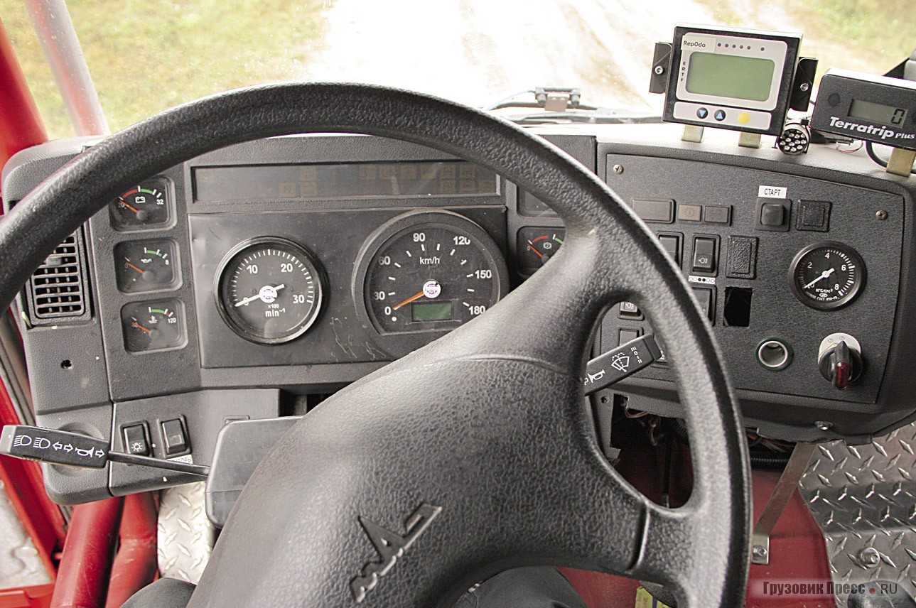 Разгон не похож на ускорение кроссовера, но с высоты полета воспринимается вполне адекватным. Разлившуюся лужу пытаюсь преодолеть сходу и… оп-ля, удар такой, что кажется, подвеске пришел конец. Но нет, МАЗ порыкивая двигателем уверенно продолжает свой путь, хотя предупреждение я принял к сведению. Рычаг КП сначала кажется ватным и нечетким, но к этому настолько быстро привыкаешь, что первоначальное недовольство хочется списать на волнение от встречи с настоящим болидом.