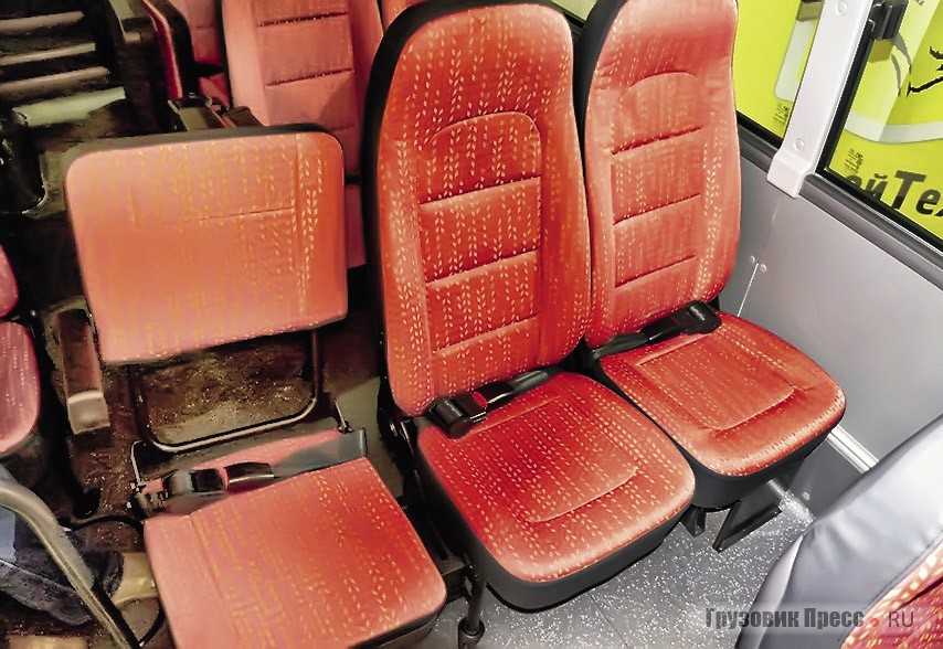 Презентуемая версия оказалась в комплектации «Стандарт»: одна полноценная служебная дверь сегментного типа, 19 стационарных мест и ещё 5 откидных «стульчиков». Кстати, сидеть на «допместах» оказалось довольно удобно, разумеется, если речь не идет о разбитой дороге или многокилометровом рейсе в соседнюю область. А ещё это, пожалуй, первый автобус подобной компоновки, в котором место рядом с водителем не условно-служебное, а полноценное пассажирское – с нормальным проходом и удобной посадкой.
