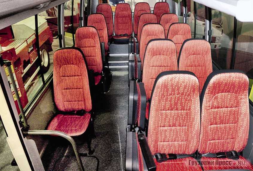 Пассажирская зона бывает разной, предлагается от 28 до 49 посадочных места. При максимальном количестве салон будет представлен двумя рядами кресел с двойными справа. На двойных креслах в середине присутствует широкий подлокотник. Обшиты сиденья тканью, в них интегрированы подголовники, дорогие версии предлагают кожаную обшивку.
