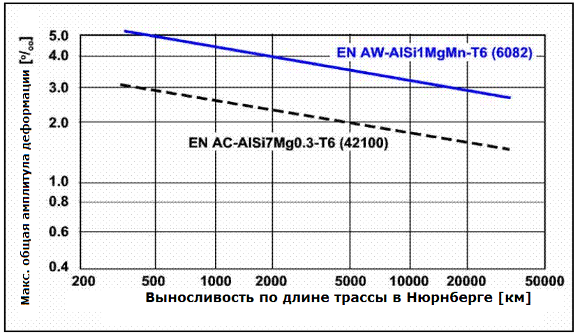 Рисунок 4 – Кривые усталости для кованого сплава AlSi1MgMn-T6 (6082-T6) и литого алюминиевого сплава AlSi7Mg0,3-T6 (источник – фирма Otto Fuchs)