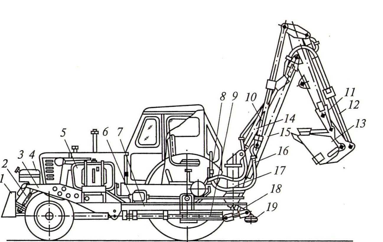 1 — отвал бульдозера; 2 — гидроцилиндр отвала бульдозера; 3 — рама бульдозера; 4 — топливный бак; 5 — бак гидросистемы; 6 — насосная группа; 7— рама экскаватора; 8 — гидрораспределитель; 9 — механизм поворота; 10 — гидроцилиндр рукояти; 11 — рукоять; 12 — гидроцилиндр ковша; 13 — ковш; 14 — гидроцилиндр стрелы; 15— стрела; 16— соединительный трубопровод; 17— поворотная колонна; 18 — гидроцилиндр выносной опоры; 19 — выносная опора
