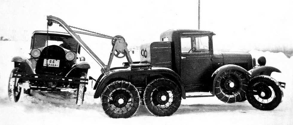 Самый первый эвакуационный автомобиль — это ГАЗ-АААА, он был выпущен в 1936 году, представлял собой экспериментальную разработку, созданную, согласно чертежам В.А. Грачева. Данный эвакуатор был произведен на основе популярной в то время полуторки ГАЗ-АА. Эвакуационная машина имела вид трехосного небольшого грузовика и обладала двигателем, мощность которого составляла 40 лошадиных сил. Этот двигатель позволял автомобилю разгоняться до 70 километров в час. Благодаря пассивному вращению дополнительной пары колес, установленной сзади передней пары, по бортовым поверхностям, автомобиль мог переезжать различные сложные неровности. Эвакуатор обладал колёсной формулой 6 × 4. Эта машина использовалась в качестве технической помощи, благодаря находящейся в заднем отсеке механизма, похожего на кран с ручной лебедкой.