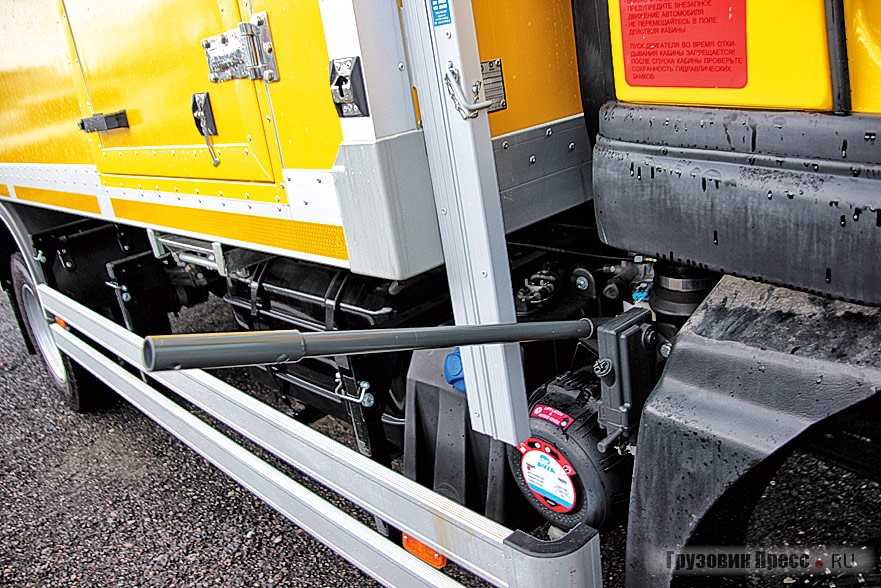 Гидравлический подъемник кабины характеризуется компактностью, он расположен за брызговиком перед водителем. Для проверки уровня масла предусмотрен щуп большой длины с пружиной.