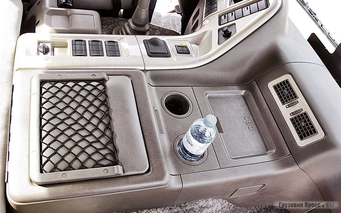 Высокий моторный тоннель с рычагом коробки переключения передач, расположенным справа от водителя, чётко разделяет кабину на две рабочие зоны. И перебраться из одной в другую, не выходя из кабины, очень трудно, практически невозможно. Да и на откидную спальную полку с места водителя забраться весьма нелегко, особенно с непривычки.