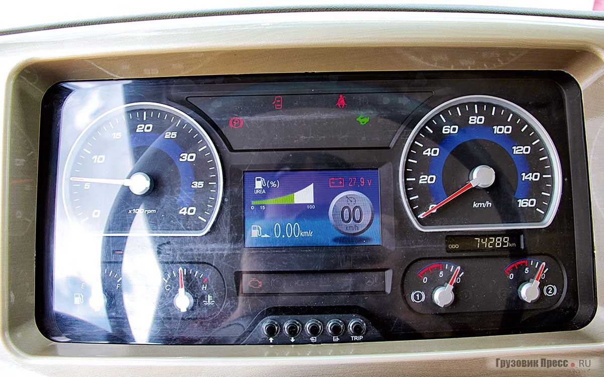 Между спидометром и тахометром имеется большой жидкокристаллический дисплей, на который выводится информация бортового компьютера (правда, по-корейски или, как вариант, по-китайски). Однако многие основные показания благодаря пиктограммам могут быть понятными и без перевода: это, в частности, уровень дизтоплива, ресурс двигателя, текущее актуальное состояние воздушного фильтра, аккумуляторных батарей, актуальный расход дизтоплива и т.д.