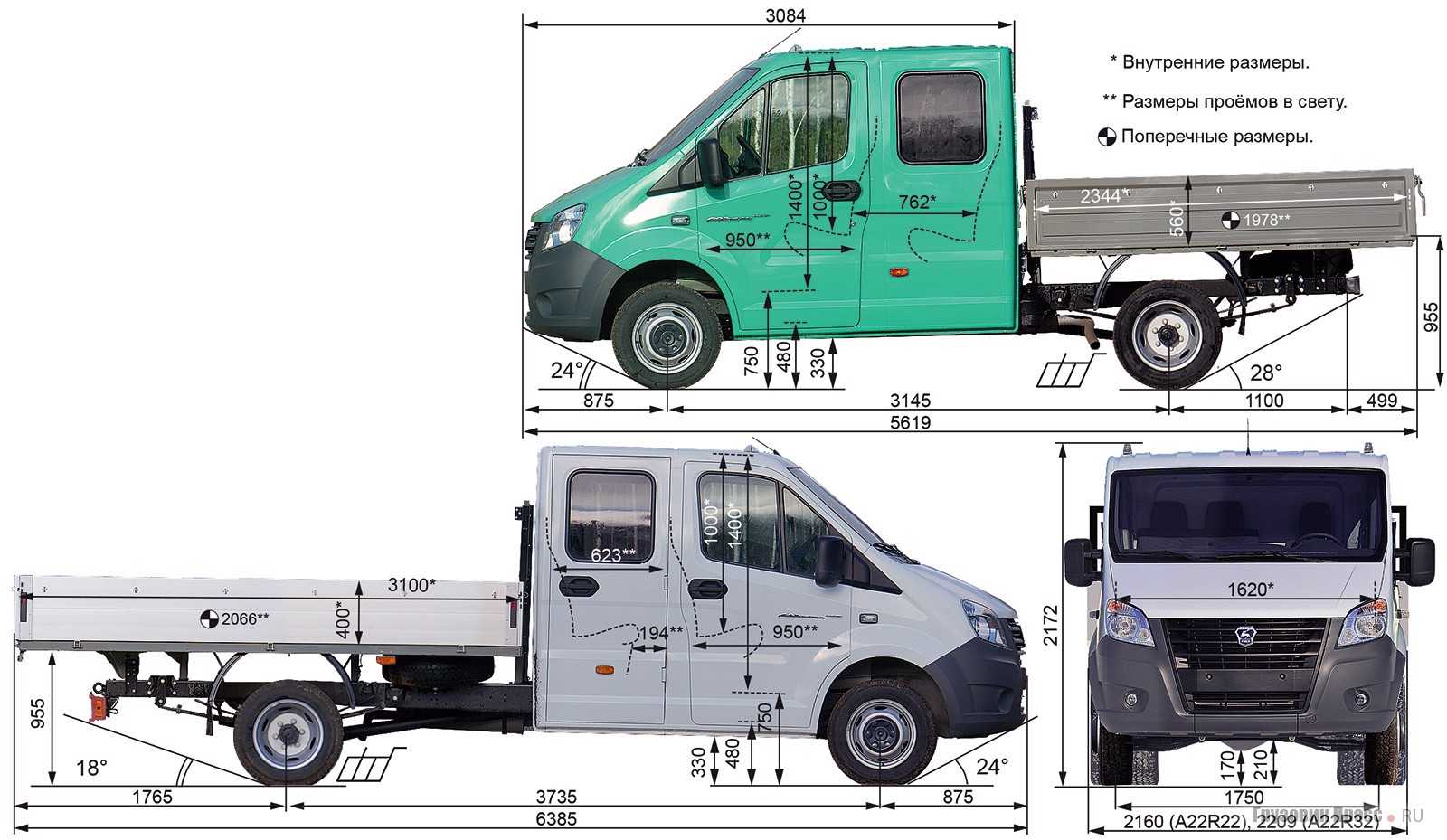 Схема и размеры газели Фермер Next Так же, как и на «Газели Бизнес», в модели Next существуют версии с обычной и удлиненной рамой, соответственно, с длинной базой авто стоит дороже. Гидроусилитель руля на этом автомобиле уже устанавливается штатно, здесь также присутствует и круиз-контроль. Технические характеристики «Газель next Фермер» (стандартная база):