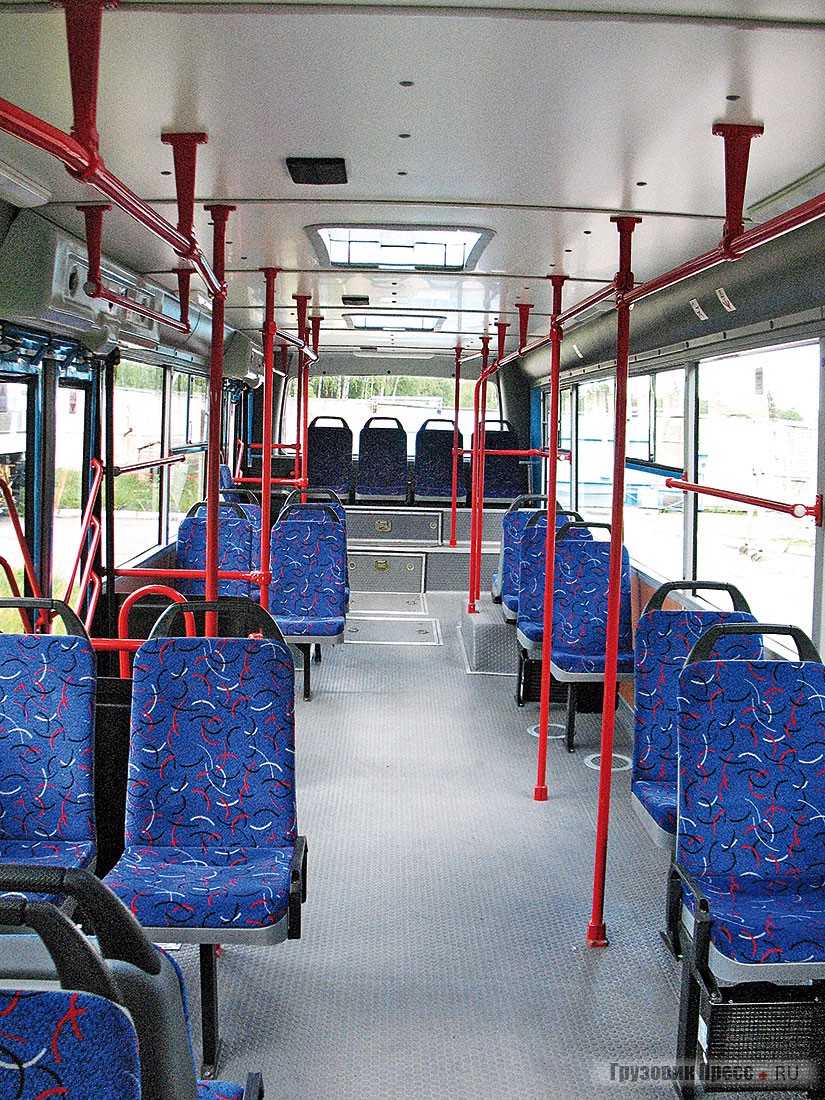 Интерьер осовременен: серые панели, прикрывающие оконные стойки; яркие львовские сиденья; две полноценные накопительные площадки; бегущая строка информационной системы «Интеграл». Особо отмечу стеклянные потолочные люки, добавляющие свет в салон непривычное решение для постсоветского автобусостроения.