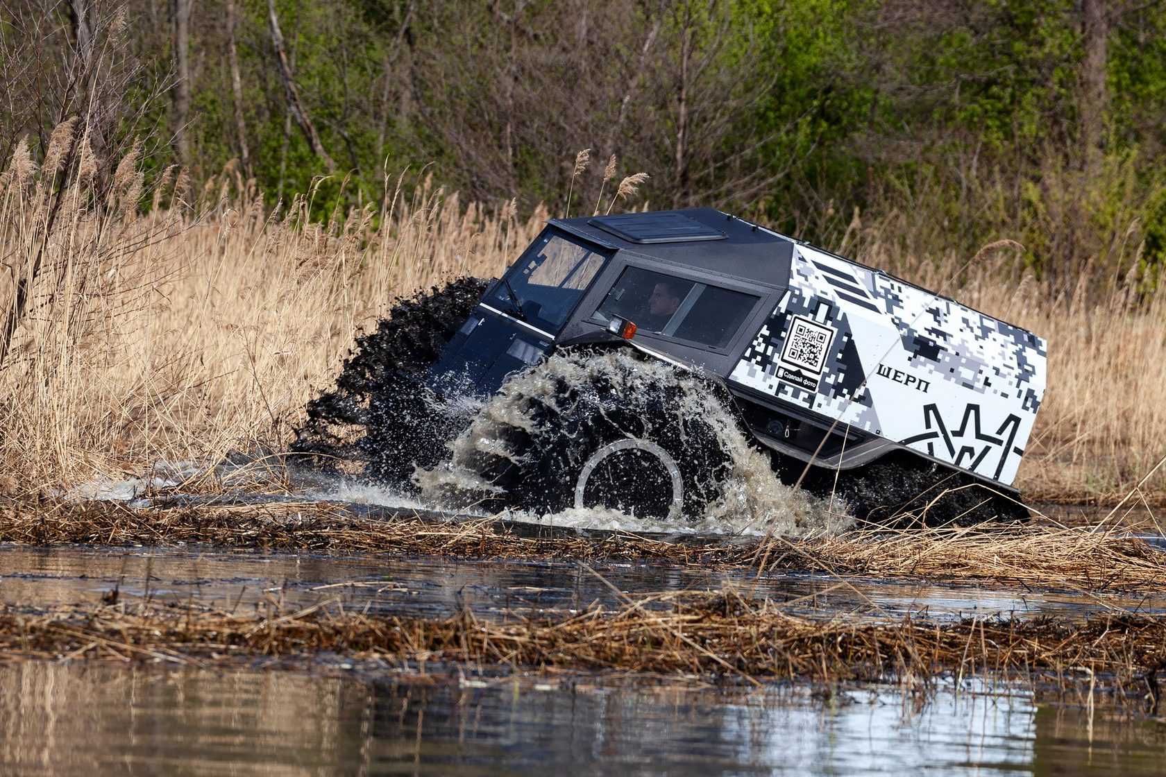 Преодолевает препятствия высотой до 1 метра, штурмует 35-градусные подъемы, без проблем выбирается из воды на лед и обратно, а плавать может сутками напролет. Это всё о нем, о «Шерпе», удивившем весь мир своими возможностями. Вездеход-амфибия эксплуатируется на шинах сверхнизкого давления. Колеса огромные – 1,5 метра. Протектор выполнен в форме гребных лопаток, поэтому машина может спокойно плавать по воде.