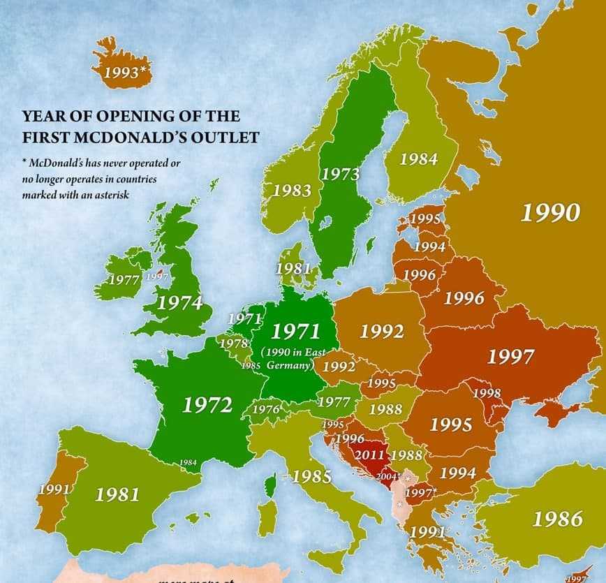 Если вы ходите узнать когда открывали первые McDonald’s в Европе, вы сможете узнать детальнее на следующем фото. Самые первые Макдональдсы Европы были открыты в Нидерландах и Германии, в 1971 году. Макдональдс появился еще во времена СССР. 31 января 1990 года, на Пушкинской площади в Москве был открыт самый первый ресторан. В Украине первый Макдональдс появился 24 мая 1997 года на метро Лукьяновская в Киеве.