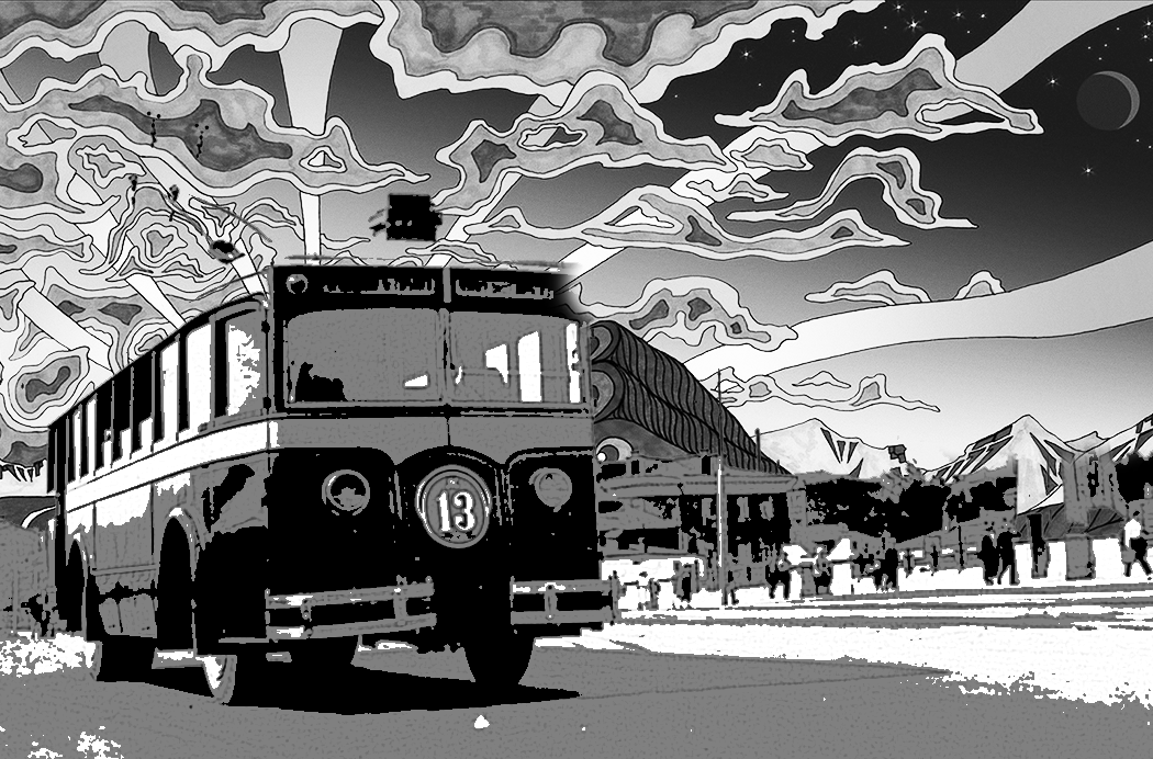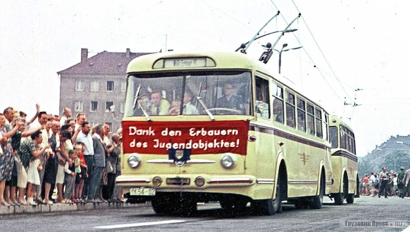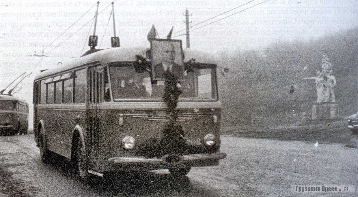 Škoda 8Тr в двухдверном исполнении для междугородной линии Симферополь–Алушта. На фото пуск участка у Ангарского перевала, 06.11.1959 г. Первый троллейбус украшен портретом Н.С. Хрущева