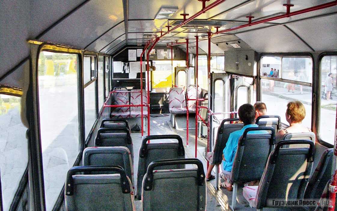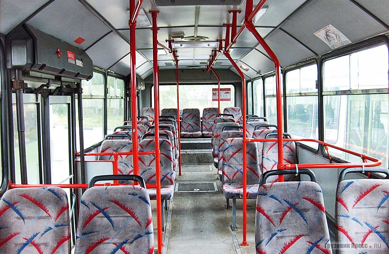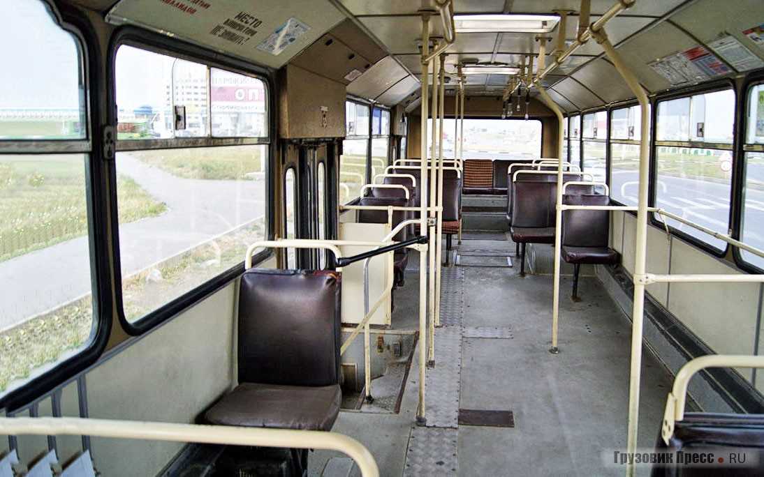 На полу сохранился заводской линолеум. Несмотря на 29 лет эксплуатации он всё ещё сохраняет свою шероховатость, то есть, зимой пассажир не подскользнётся. И никаких ступенек или подиумов. Запнуться не обо что. А ведь травмы в автобусах – явление не редкое.