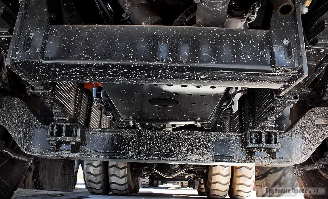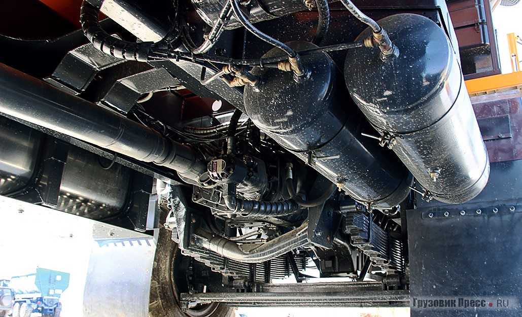 Транспортировка сырья в таких объёмах возможна благодаря оснащению. Конструкторы укомплектовали трёхосный самосвал с колёсной формулой 6х4 пневмо-рессорной передней подвеской, а на заднюю поставили балансирную на упругих резиновых элементах.
