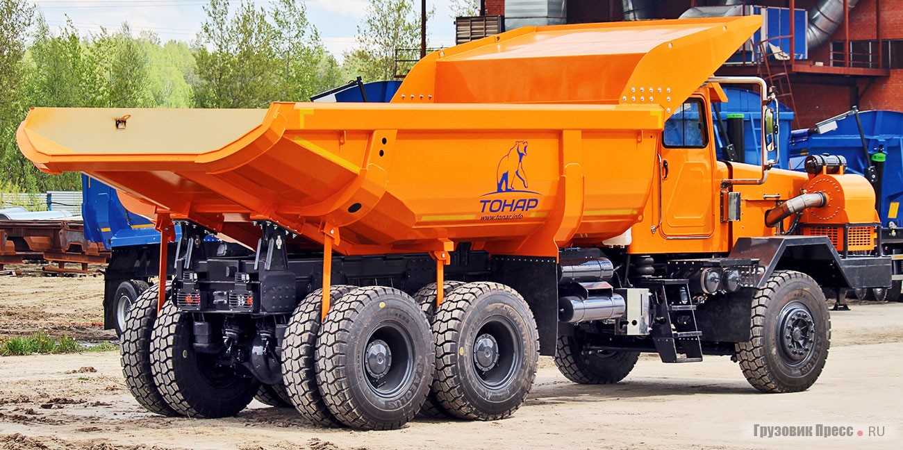 Если многотонные специализированные карьерники значительно отличаются от грузовиков силовыми схемами и органами управления, то ТОНАР-45251 шириной около 3,5 м, длиной почти 11 м, высотой 4,7 м и полной массой 69 т воспринимается как обычный самосвал, только очень большой…
