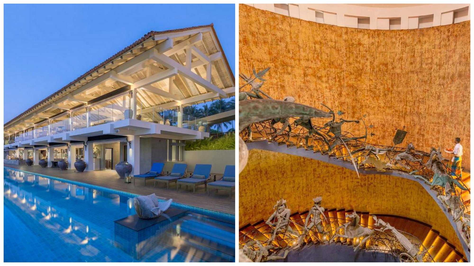 Открытая веранда Anantara Resort в Калутаре / Винтовая лестница, которая изображает битву 17 века между сингальцами и португальцами в отеле Lighthouse в Галле. Фото: Anantara Kalutara Resort, Jetwing Lighthouse / Booking.com