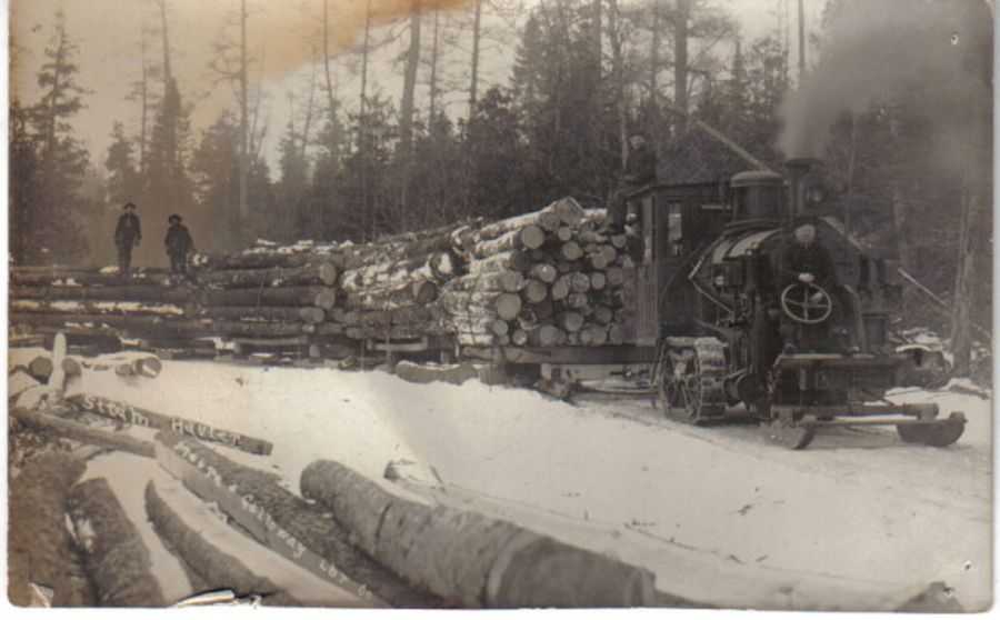 «Ломбард» с одноцилиндровыми горизонтальными паровыми машинами на лесозаготовках в штате Висконсин. На котле установлен подковообразный водяной бак, а рабочее место рулевого закрыто самодельной «будкой» из брезента для защиты от холодного ветра и искр, летевших из трубы.