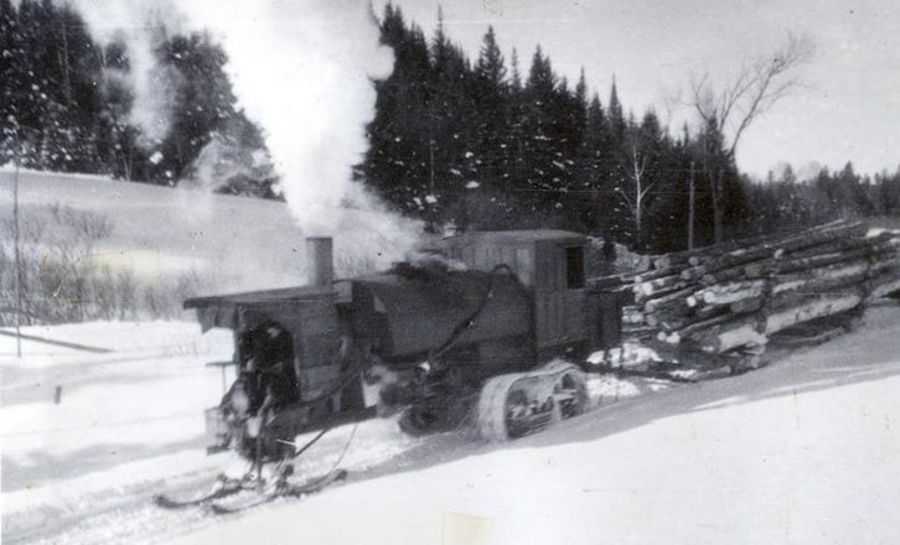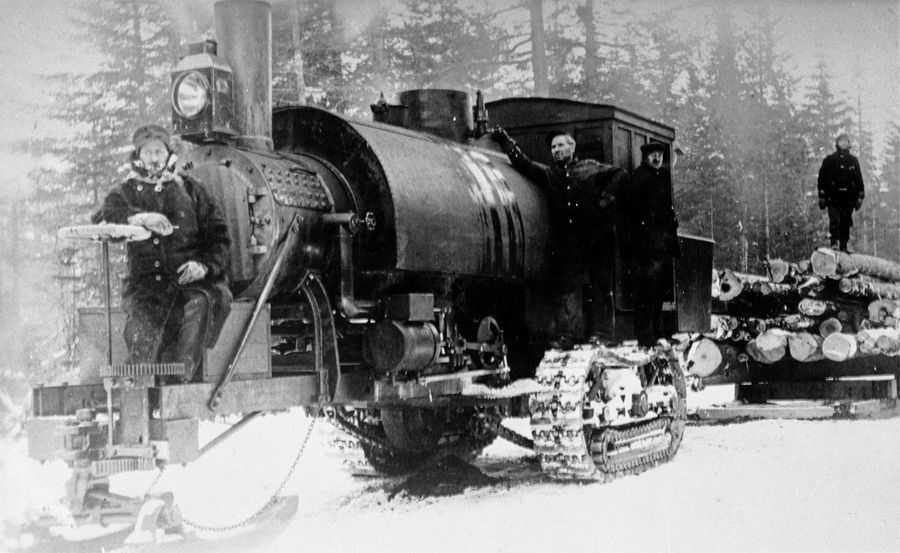 Полугусеничный паровой снегоход Ломбарда обслуживали четыре человека. Трое находились на самом паровозе и еще один — на санях с бревнами