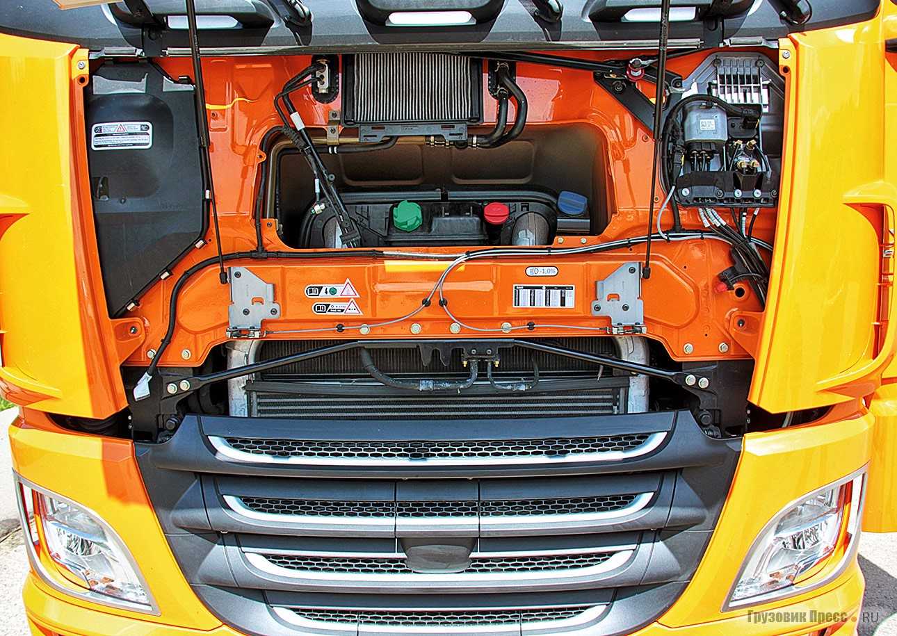 Под капотом у тягачей обоих поколений есть всё, что нужно для ежедневных проверок и при необходимости долива. На фото видно, как мультиплексная проводка и компоненты охлаждения преёмника (Euro 6) изменили компоновку при том же каркасе кабины