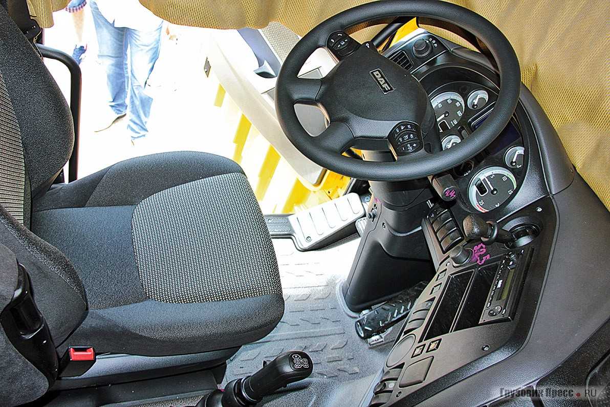 Водительским креслом с пневмоподвеской и регулируемой жёсткостью нынче никого не удивишь, но у DAF и здесь своя «изюминка» – пневмоопоры поясницы. Причём такой же комплект опций имеет и пассажирское сиденье, а это уже серьёзное заявление в борьбе за покупателя и, кстати, водителя. Уходящее в прошлое традиционное построение панели приборов – круглые, подробно оцифрованные шкалы спидометра, тахометра, указателя температуры, уровня топлива, давления воздуха, несомненно, будут радовать глаз своим здоровым традиционализмом. Ведь тенденция «выуживать» необходимые показания, меняя с помощью мудрёных алгоритмов области данных на дисплее бортового компьютера, захватившая всё современное автомобилестроение, по вкусу далеко не всем.