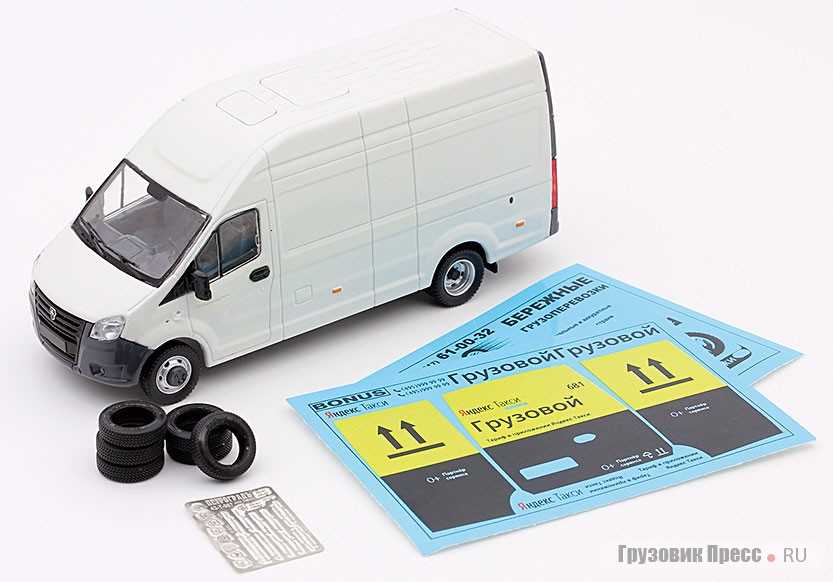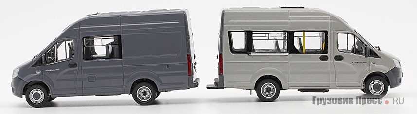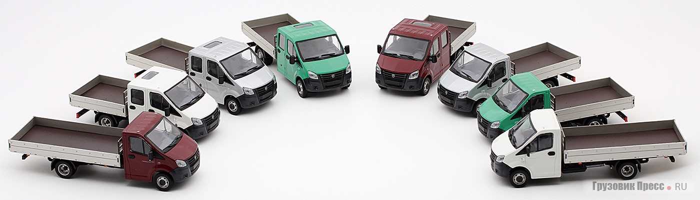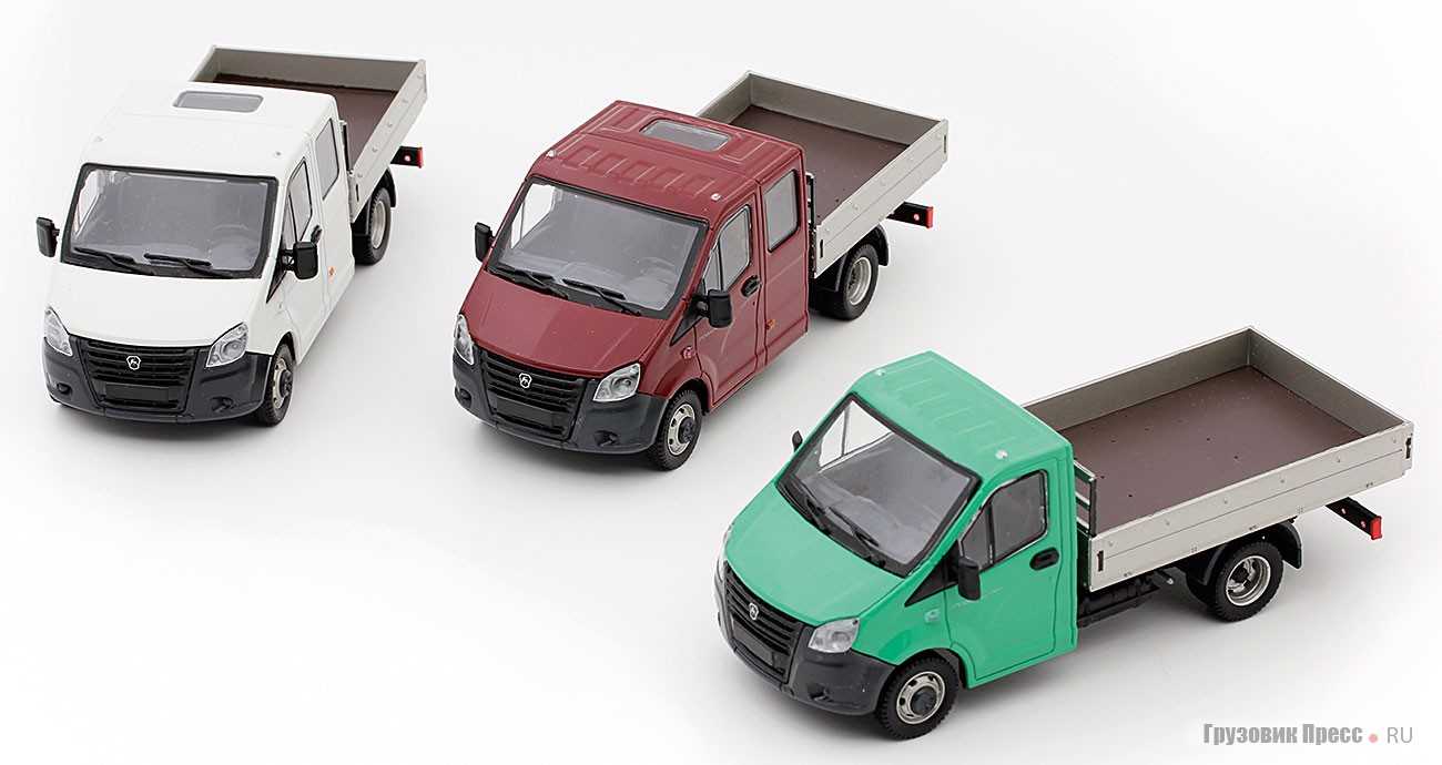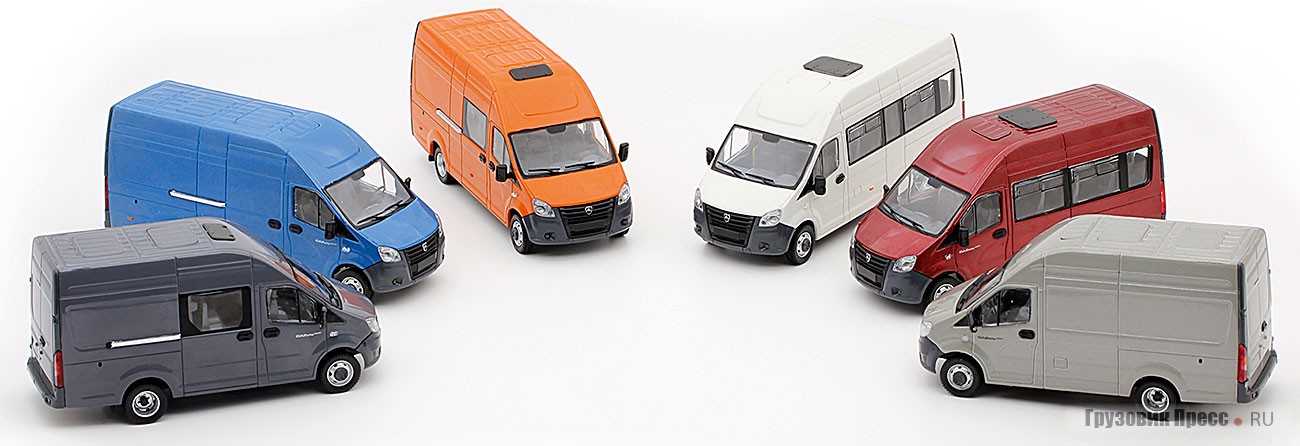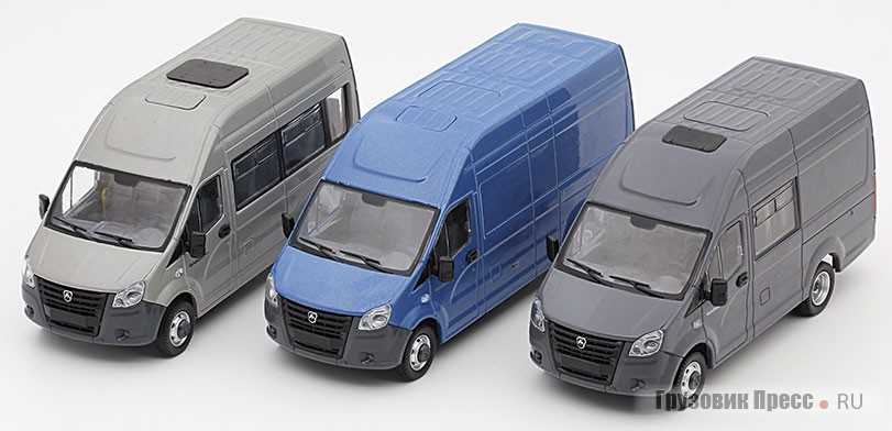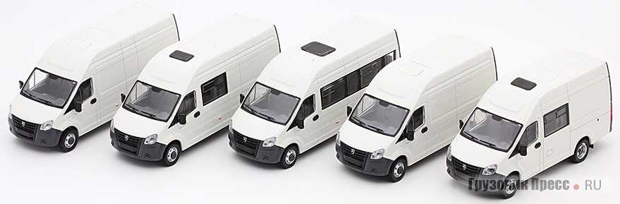 Бортовые модели соответствуют модельному ряду ГАЗель NEXT 2014 года (некоторые внешние отличия: боковые зеркала на 2 ножках, рычаг КП «из пола», металлический топливный бак и др.) в вариантах с алюминиевыми бортами, 4 модификации (A21R23, A21R33, A22R23, A22R33), каждая в 2 цветах. Масштабные модели цельнометаллических фургонов относятся к модельному ряду 2016 года, 6 модификаций (A31R23, A31R33, A32R23, A32R33, A65R23, A65R33 «маршрутка»), каждая в 2 цветах, один из которых белый. Только лишь колёсные диски оставлены ранние.