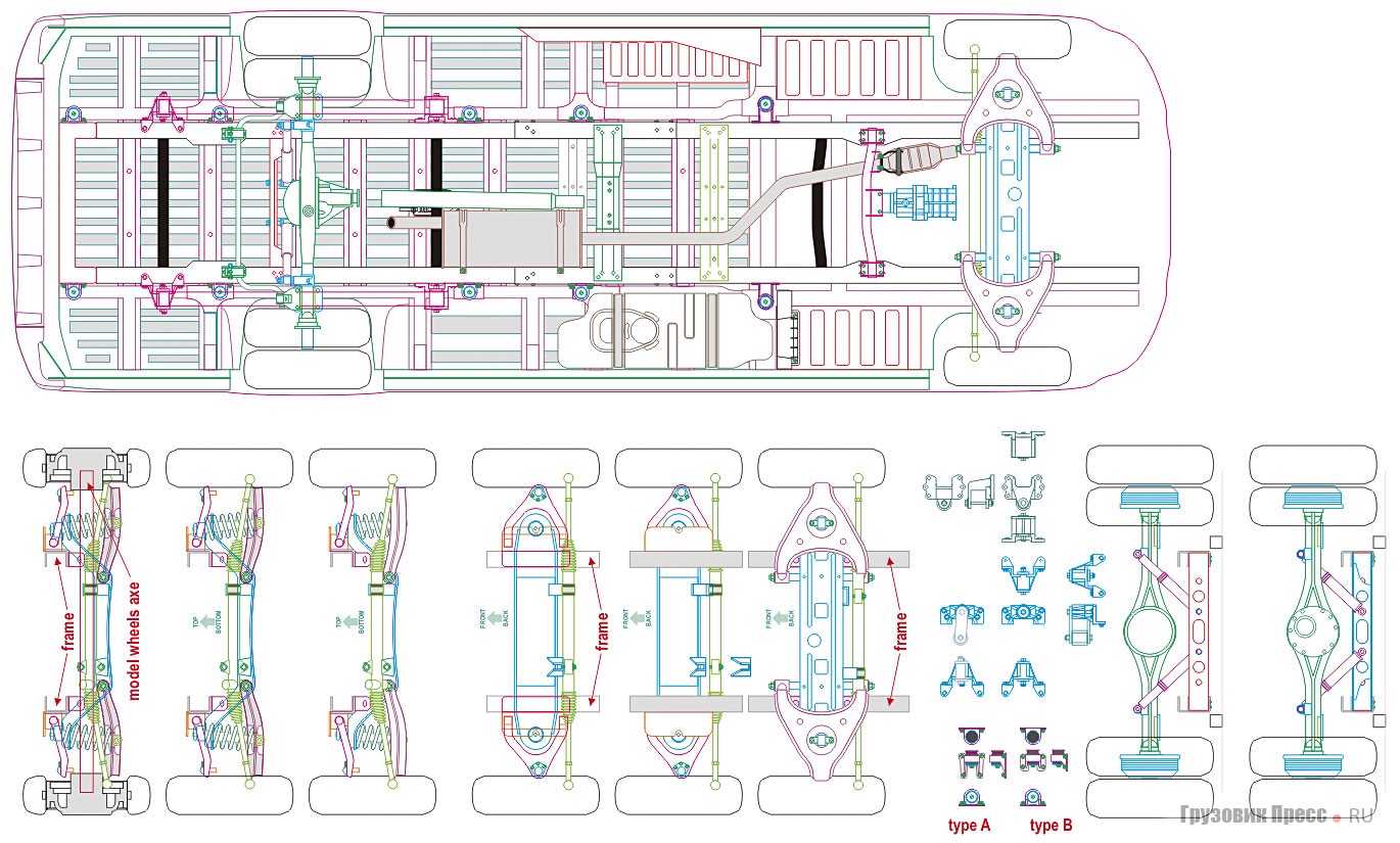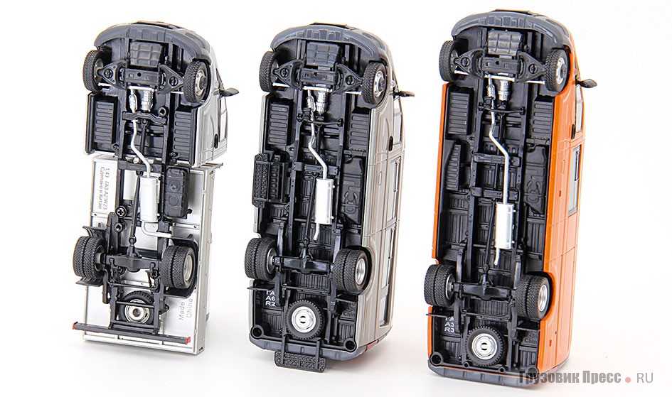 Проработка днища максимально соответствует реальному, как по детализации, так и по «амплитуде рельефа», превосходя по исполнению аналогичные элементы даже очень именитых западных брендов (например, Minichamps). Задний мост увеличен для возможности размещения в нём оси задних колёс.