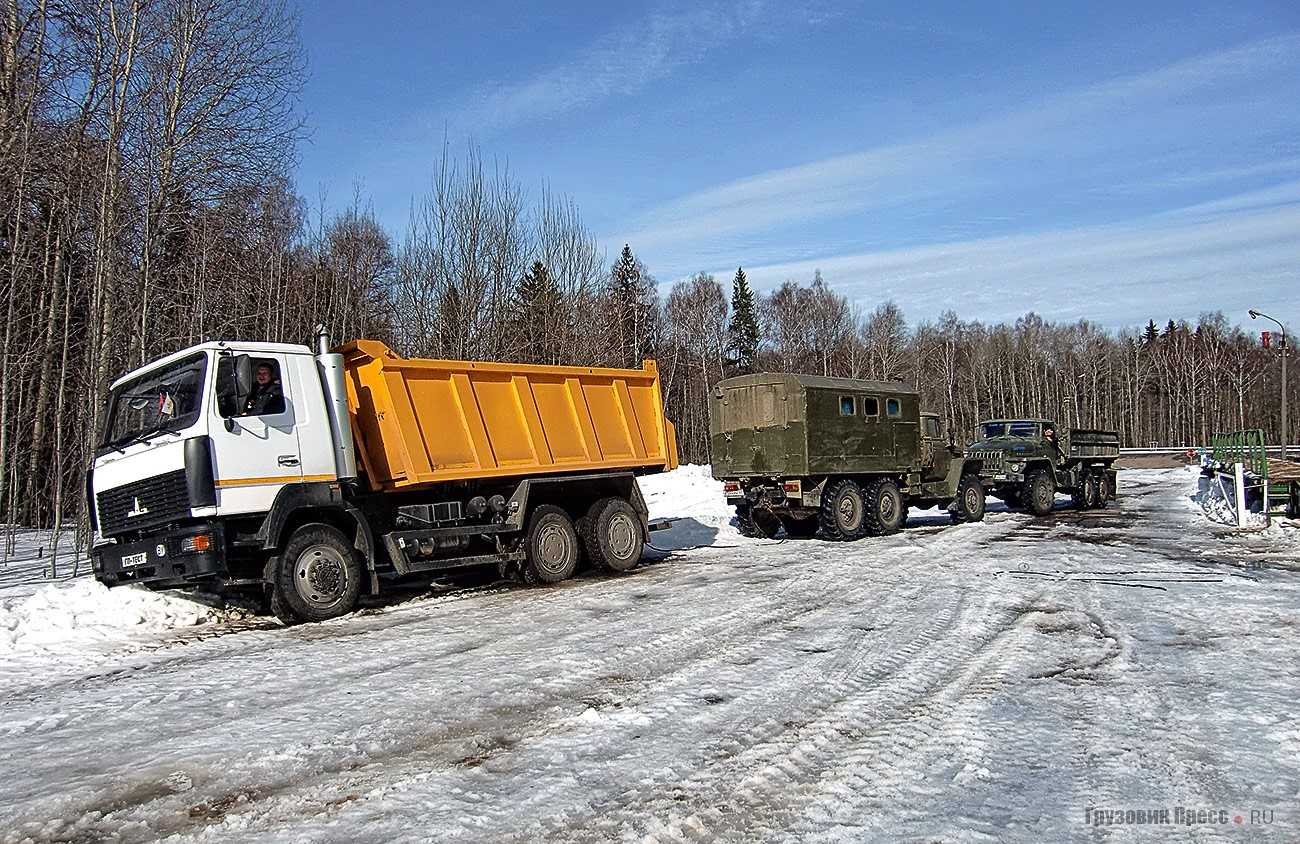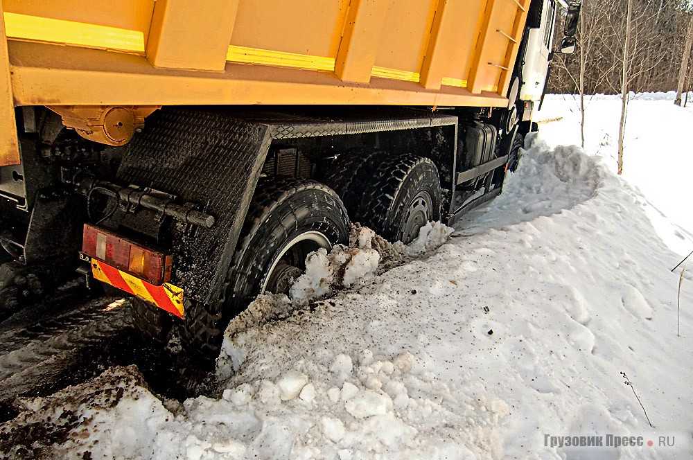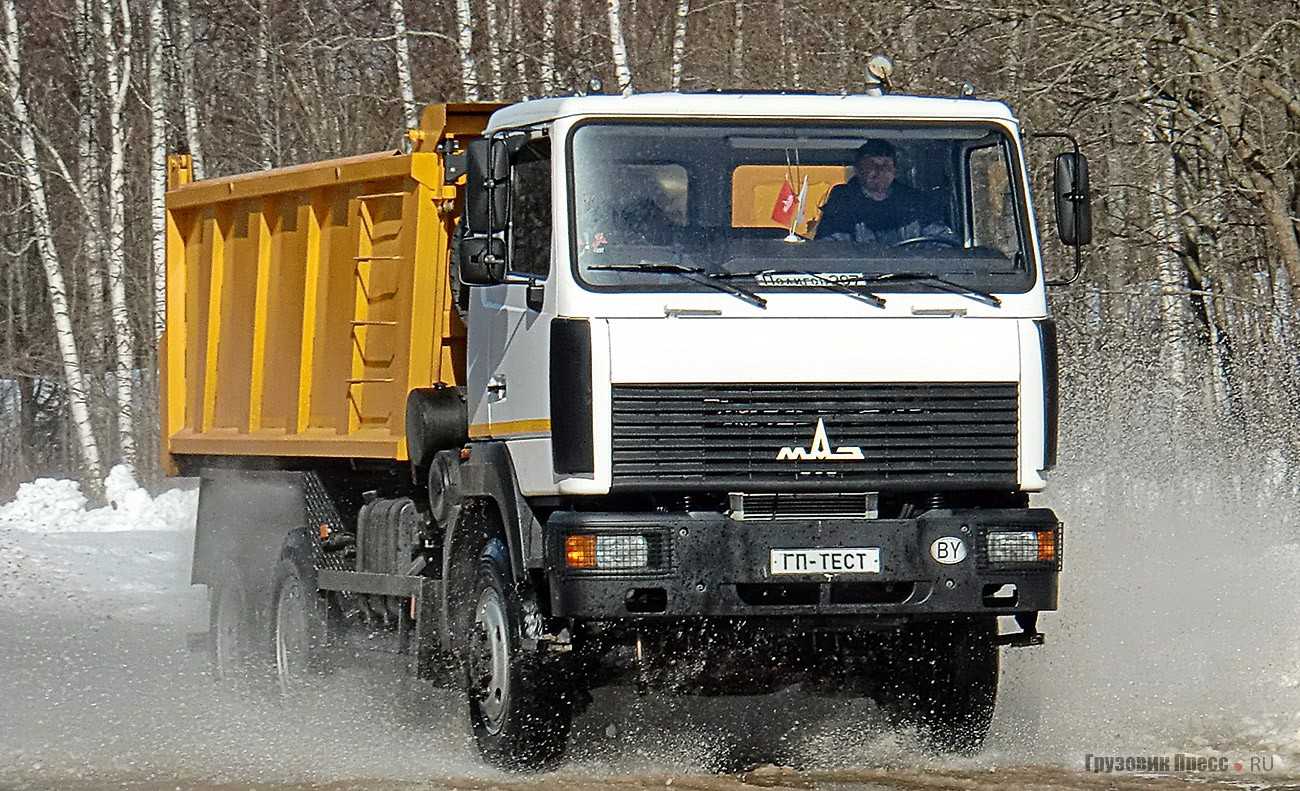 Мы не планировали проводить внедорожные покатушки, несмотря на то, что наш подопечный полноприводный. Дело в том, что дорожная резина, стоявшая на МАЗе, за время испытаний конкретно износилась и съезжать на ней «в поля» было бы некорректно. Нет, конечно, для очистки совести мы покатались по 15-сантиметровой целине. Но, во-первых, для истинного строительного самосвала это не препятствие, а во-вторых, на заднем приводе и без груза МАЗ быстро упирался в подтаявший снег и начинал «самоокапываться», а после подключения передка, наоборот, просто игнорировал наст. Однако…