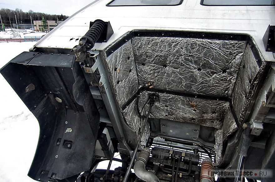 Хорошо поработали компоновщики. С левого борта машины, где обычно проезжая часть, только АКБ с кнопкой массы, пневморесиверы и рычаг управления потоком выхлопных газов. Первыми водитель пользуется на стоянке перед выездом и вечером, а вторыми обычно тоже после смены для слива конденсата. Про обогрев кузова и говорить не стоит – на трассе к рычагу точно никто не полезет.