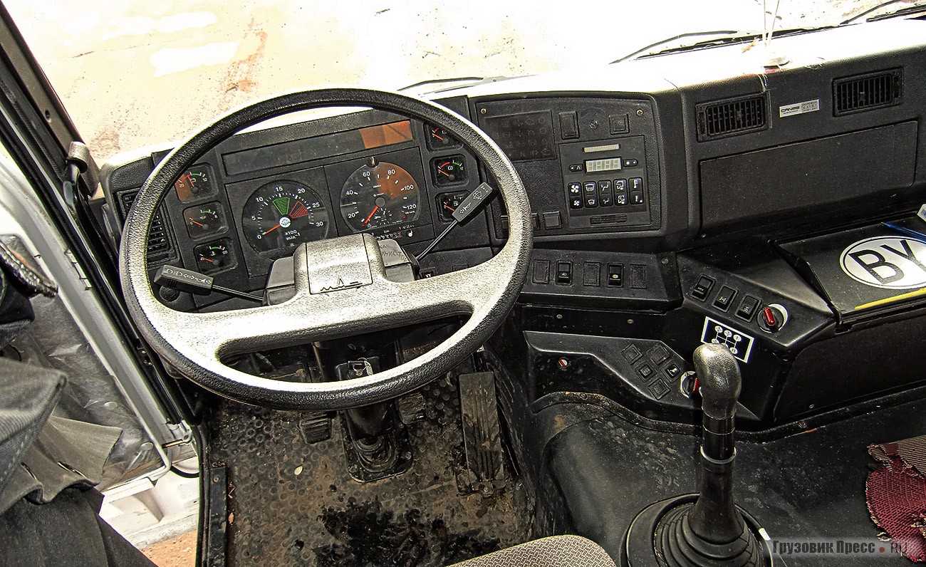 Самой неприметной частью полноприводника оказалась кабина. А все потому, что в материале о МАЗ-5550В2 и МАЗ-5550В3, 2010 г.) о ней почти все рассказано. Стоит только отметить, что блок управления вентиляцией и отоплением здесь электронный и добавились клавиши подключения блокировок. Для особо внимательных уточню, что лампа дневного света а-ля Ikarus – инициатива испытателей, с ней в кабине намного светлее. А еще мы проверили качество покрытия моторного кожуха. Приятной неожиданностью оказалось то, что 5-литровое ведро, полное инструмента, даже не пытается обрушиться на стекло при полностью откинутой кабине. Кстати, чтобы ее поднять, необходимо сделать 100 качков монтировкой, а чтобы опустить – всего 67.
