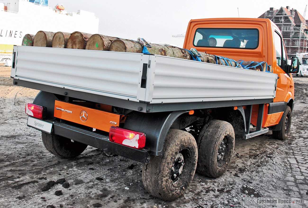 В этот раз решено поступить наоборот: Mercedes-Benz Sprinter CDI Oberaigner 6×6 оказался с простой надстройкой в виде бортовой платформы и был загружен брёвнами. Небольшой объём сырой древесины, на глазок не более 3,5—4-кубов, тем не менее автомобиль мерседес бенц спринтер 519 около двух тонн, а этот с виду небольшой грузовичок способен взять до кг.