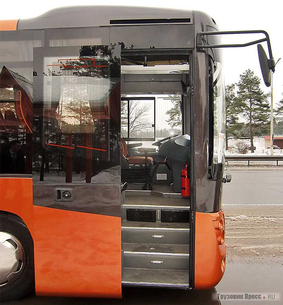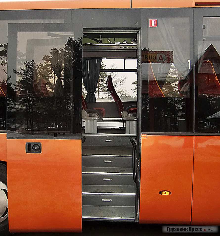 В салон традиционно ведут две прислонно-сдвижные двери. Причём, как и у зарубежных аналогов, предусмотрена двустворчатая 2-я дверь. Сделано это не ради увеличения скорости посадки-высадки, а для возможности размещения оборудования для перевозки лиц с ограниченными физическими возможностями. По сути, автобус достаточно уже сейчас оснастить кнопками связи с водителем с нескольких пассажирских мест, и он получит одобрение по дополнительным требованиям.
