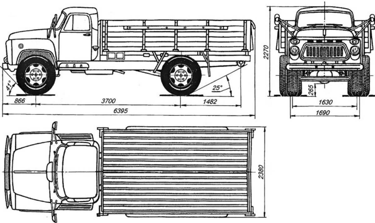 Годы выпуска: 1961–1967. - Самосвал ГАЗ-53А. На автомобиле стоял уже V-образный двигатель ЗМЗ-53 с восемью цилиндрами. Мощность поднялась до 115 л. с. Грузоподъёмность – 4 т. Грузовик разгонялся до 85 км/ч.