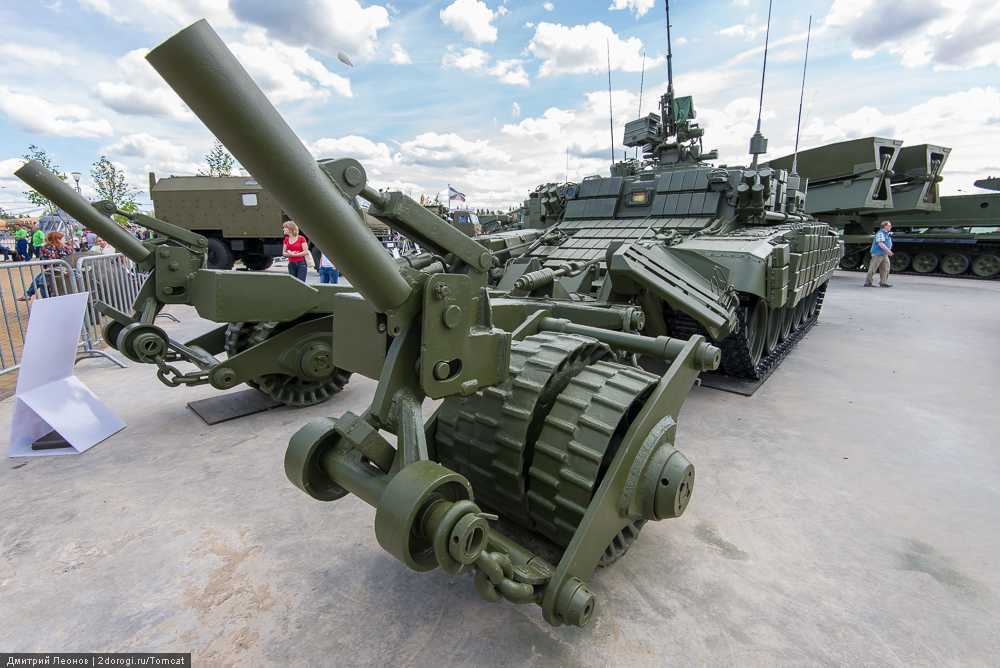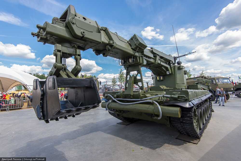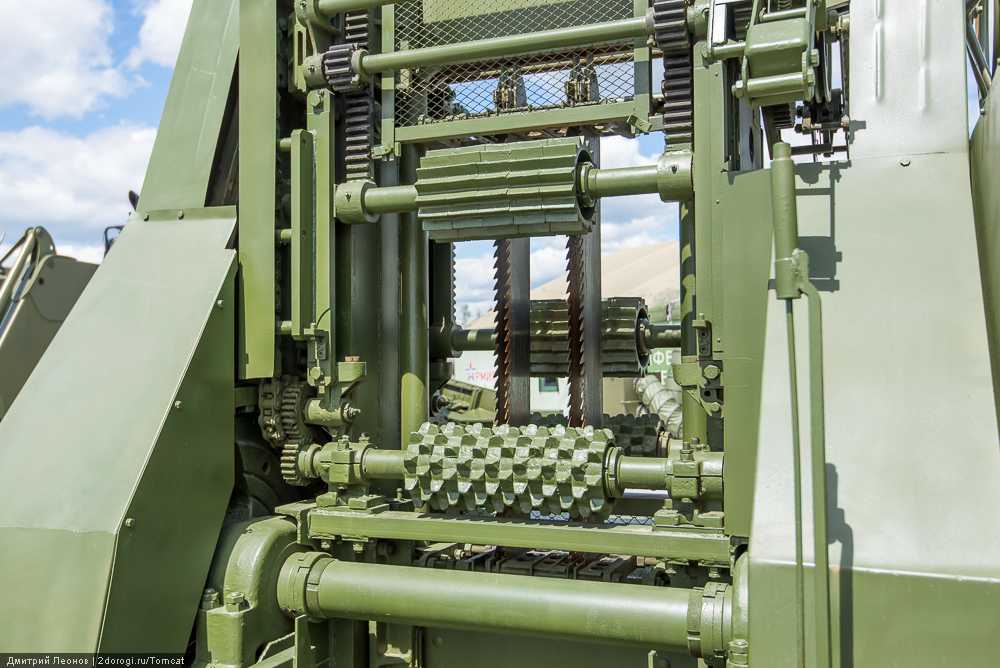 Бронированная машина разминирования. БМР-3М «Вепрь». Предназначена для разведки, преодоления и разминирования минных полей, путей движения войсковых колонн, создания проходов в минных полях при огневом противодействии противника. Главное вооружение машины — катковый минный трал КМТ-7 и электромагнитный трал ЭМТ (толстые цилиндры над катковым тралом, создаёт имитацию электромагнитного поля танка, подрывая мины с магнитным взрывателем на безопасном расстоянии).
