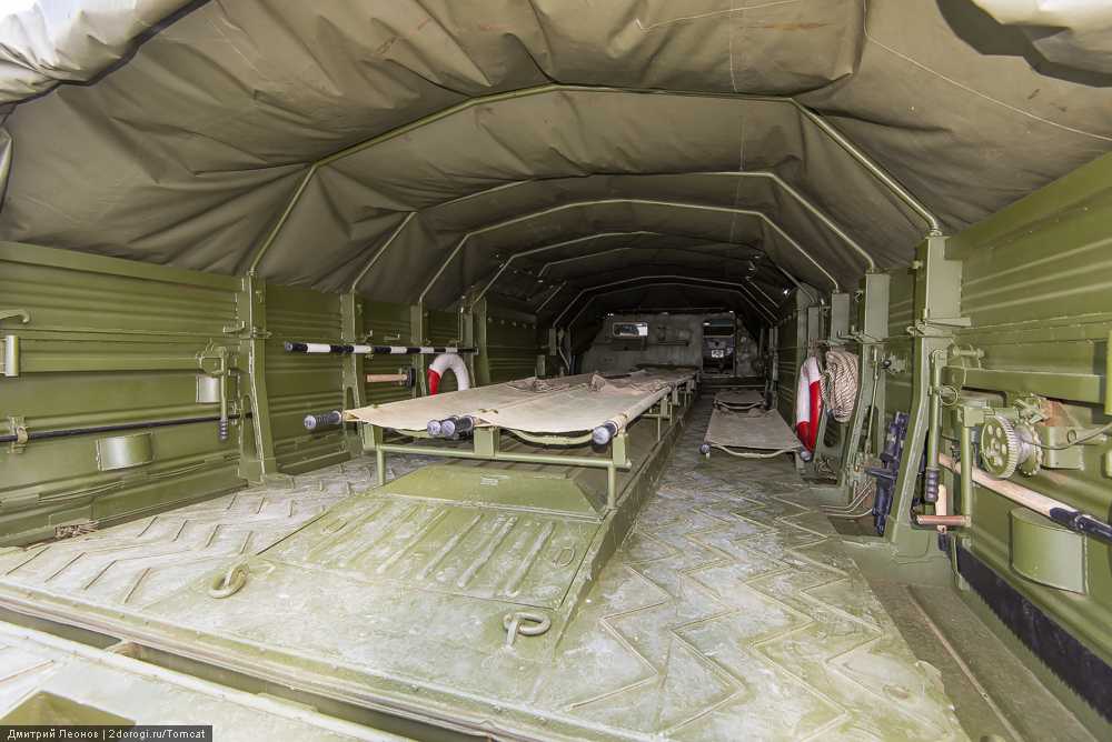 В грузом отсеке ПТС-2. Транспортёр может выполнять роль санитарно-эвакуационной машины, для чего в кузове имеются крепления для 12 носилок.