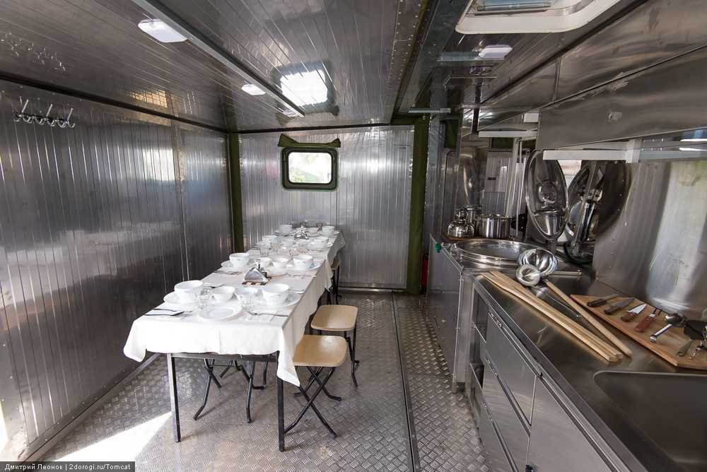 Кухня-столовая автомобильная. Кухня предназначена для приготовления горячей пищи из 2-х блюд, кипятка и выпечки хлеба в полевых условиях. Количество питающихся (3-х разовое питание) — 220 человек. Время развертывания кухни в рабочее состояние(без заправки водой и топливом) — 5 минут.