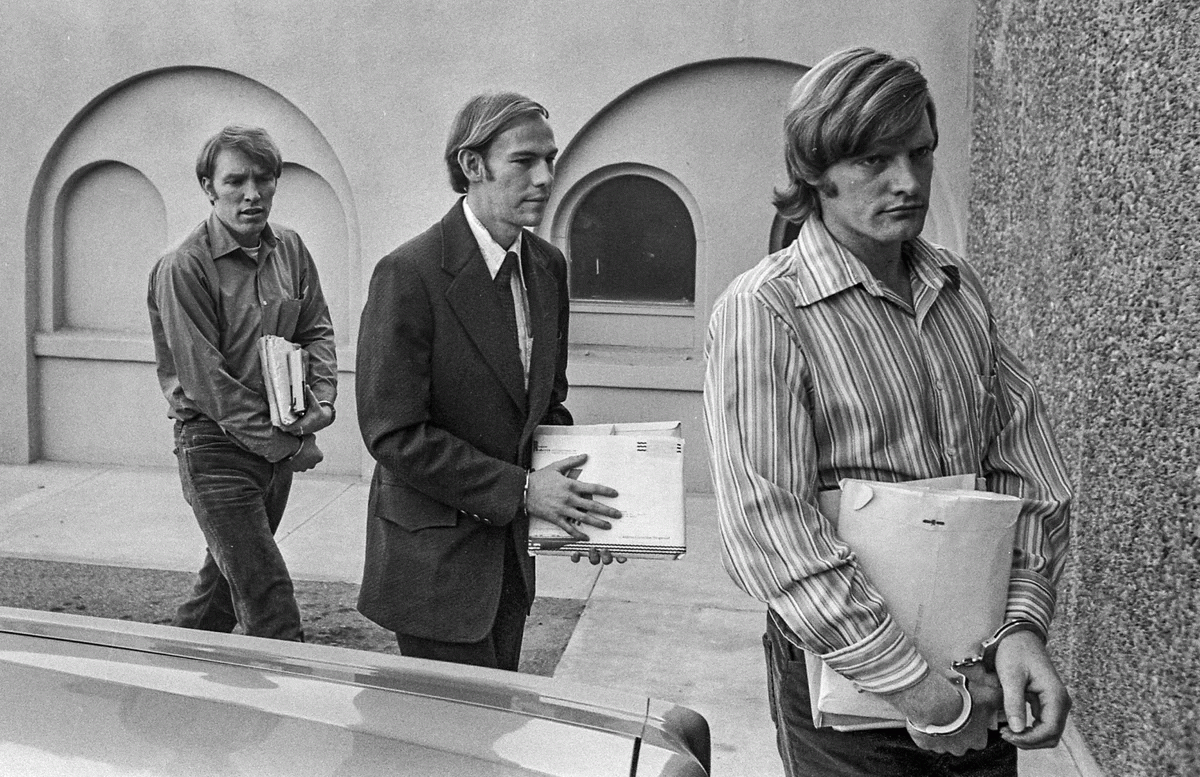 19 октября 1976 года. Джеймс Шёнфельд, Фред Н. Вудс и Ричард Шёнфельд прибывают на судебное заседание в Мадера, штат Калифорния