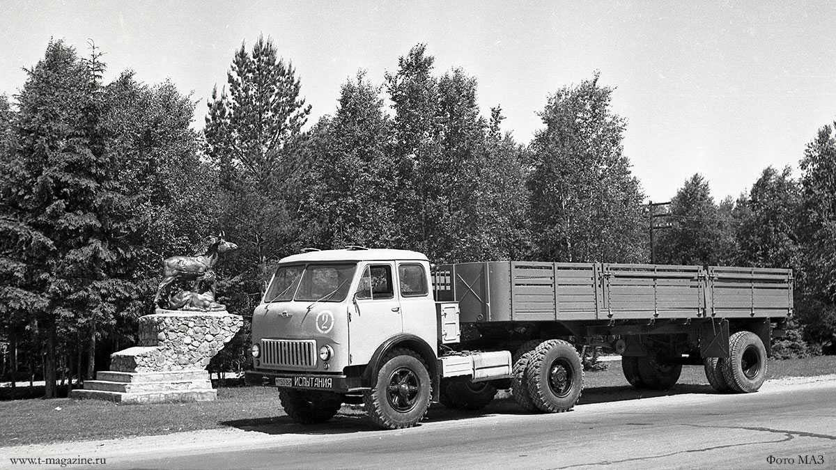 пошёл седельный тягач МАЗ-200В, предназначенный для буксировки полуприцепов (также производства МАЗ) по дорогам с усовершенствованным