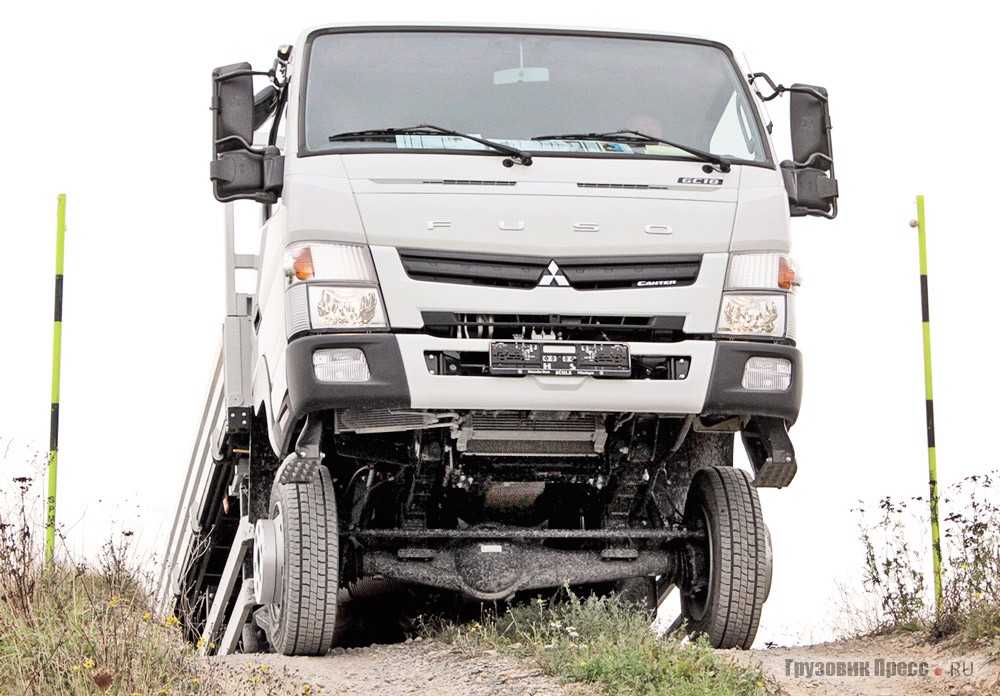 При желании на повышенной пятой передаче его можно разогнать до 128 км / ч, но всё же его основное достоинство – хорошая тяга во всём диапазоне оборотов, что очень важно именно на плохих дорогах. Благодаря обеим ведущим мостам Fuso Canter придает уверенности там, где одноклассник с моноприводом способен забуксовать. Лишь один из немногих факторов, вызывающих неудобство при управлении автомобилем, – габаритный радиус поворота просто огромен и согласно заявленным характеристикам – 14,9 м, но на практике кажется, что «и целого мира мало»
