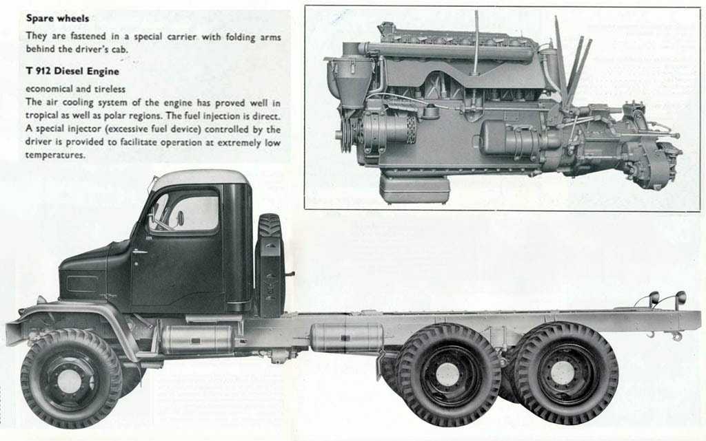 Сразу за передней осью располагался рядный 6-цилиндровый дизельный двигатель Tatra-912 воздушного охлаждения. Фактически он представлял собой «половинку» от 12-цилиндрового V-образного мотора Tatra-111. Двигатель рабочим объемом 7,4-литра выдавал всего 98 л.с. Зато его максимальный крутящий момент в 350 Нм был доступен уже с 1200 об/мин. В паре с мотором работала механическая 4-ступенчатая коробка передач, которую вместе с двухступенчатой «раздаткой» собрали в один агрегат. От нее к мостам крутящий момент передавался с помощью индивидуальных карданных валов.