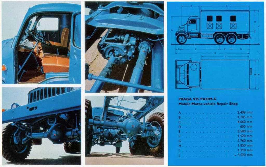 За тридцать два года производства вездеход шесть раз подвергался небольшим улучшениям, каждый раз получая очередную цифру после литеры М в своем названии (так появились Praga V3S М2…М6). Последние версии отличались дизелем с увеличенным до 8,1 л рабочим объемом, развивавшим мощность 110 л.с., усилителем рулевого управления, сиденьем водителя на пневмоподвеске и др. Семейство Praga V3S было представлено добрым десятком модификаций, самыми распространенными из которых были самосвал V3S-S с цельнометаллическим кузовом объемом 2,6 м3, военный грузовик V3S-SKS с кузовом типа кунг, армейский грузовик-радиостанция R3AT, шасси с дизель-генераторной установкой PAD, автокраны AD-060 и AD-080, ремонтная мастерская Ša, передвижной флюорографический кабинет. К числу модификаций V3S отнесем и самоходную зенитную установку М 53/59, поступавшую на вооружение армии Чехословакии с начала 1950-х годов. Созданная с максимальным использованием агрегатов серийного грузовика, установка имела двигатель и кабину на 5 человек, защищенные броневыми листами, расположенными под наклоном. В задней части размещалась вращающаяся открытая сверху броневая башня, в которой находилась 30-миллиметровая спаренная зенитная автоматическая пушка для поражения как воздушных, так и наземных целей. Темп стрельбы достигал 650 выстрелов в минуту, горизонтальная дальность стрельбы – 10 км, досягаемость по высоте оценивалась в 3 км. Боевая масса установки составляла 9,5 т, запас хода достигал 650 км.