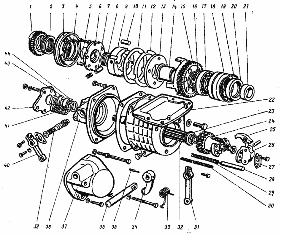 Рис. 2.1.71. Взаимное расположение деталей механизма передачи и включения пускового двигателя: 1 — нажимной упор; 2, 8, 17, 44 — подшипники; 3 — нажимной диск; 4 — упругий упор; 5 — палец; 6 — ступица; 7 — плунжер; 9, 14, 18, 21 — втулки; 10 — ролик; 11 — ведомый диск; 12 — ведущий диск; 13 — прижимной диск; 15 — ведущий барабан с зубчатым колесом; 16, 19 — кольца; 20 — манжета; 22 — корпус; 23 — специальная шайба; 24 — зубчатое колесо; 25 — груз; 26 — держатель; 27 — шайба; 28 — толкатель; 29 — пружина толкателя; 30, 33 — пружины; 31, 40 — рычаги; 32 — вал редуктора; 34 — поводок; 35 — щтифт; 36, 41 —- валики; 37, 55, 42 — крышки; 39 — валик рукоятки; 43 — стопорная шайба.