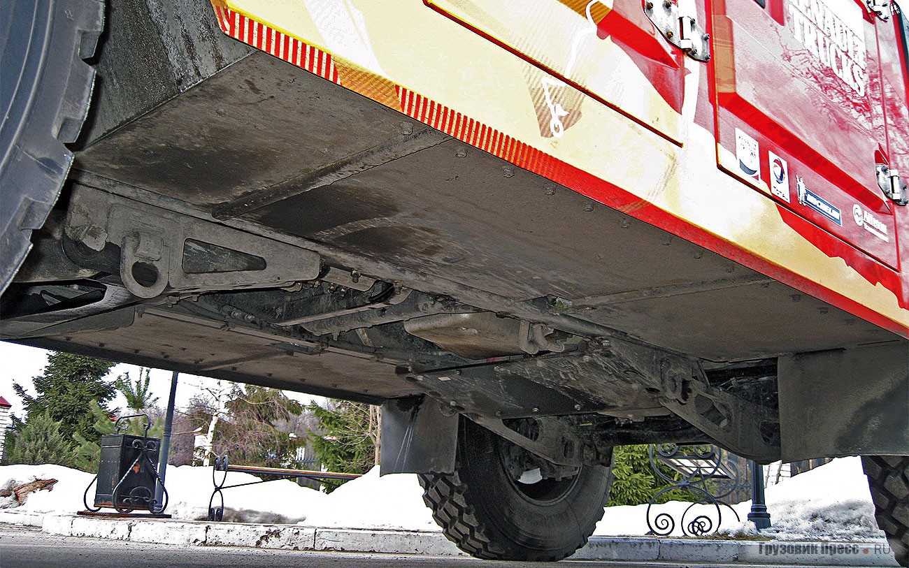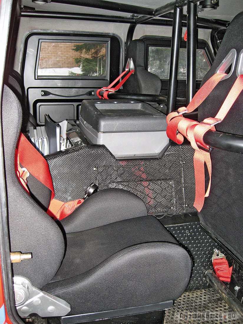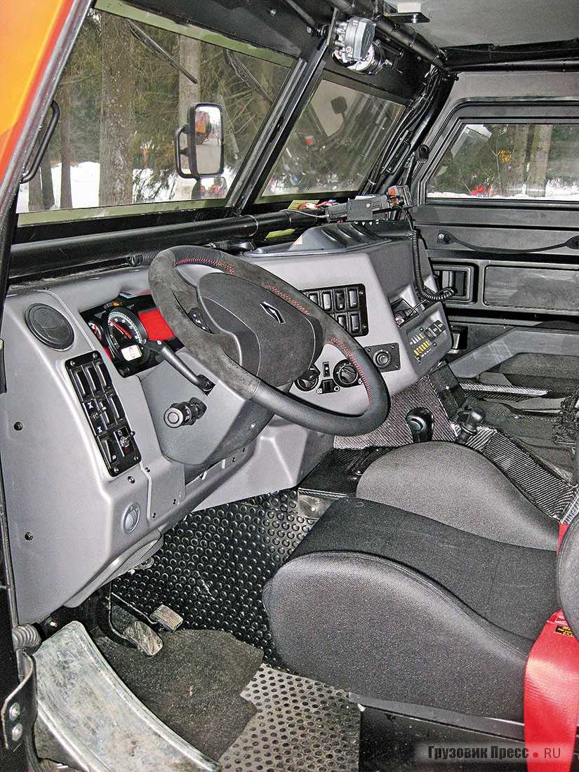 Салон Sherpa вмещает всего четверых, поскольку продольно разделен надвое высоченным трансмиссионным тоннелем. Зато благодаря подобному решению днище получилось абсолютно ровным – на первой же остановке я специально заглянул под машину и не увидел ни карданов, ни глушителя, ни выступающего картера «раздатки». Все важные агрегаты блиндированы металлической защитой. Подобная компоновка на бездорожье безусловный плюс: на сложно пересеченной местности Sherpa днищем скользит по буеракам, а не вспахивает их всеми своими агрегатами. Еще один плюс – гидромеханическая трансмиссия: благодаря ей на пересеченной местности водитель не отвлекается, орудуя рычагом, что вдвойне ценно в боевой обстановке, когда приходится внимательно следить не только за дорогой, но и за противником.