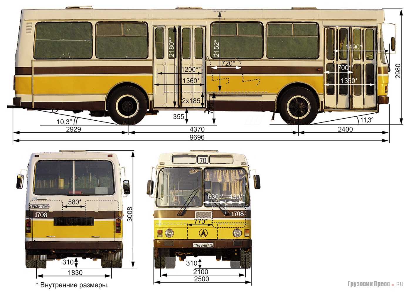 Габаритные размеры по кузову длина/ширина/высота (мм) — 9700/2500/2945База (мм) — 4370Колея передняя/задняя (мм) — 2100/1880Радиус поворота по оси внешнего колеса (м) — 8Собственная масса автобуса (кг) — 8600:нагрузка на переднюю/заднюю ось (кг) — 2350/6250Полная масса автобуса (кг) — 13400:нагрузка на переднюю/заднюю ось (кг) — 4100/9300Максимальная скорость (км/час) — 75Тормозной путь со скорости 60 км/час (м) — 32,1Контрольный расход топлива на скорости 60 км/час — 19 л на 100 км (фактически при эксплуатации возможен расход до 45 л на 100 км)