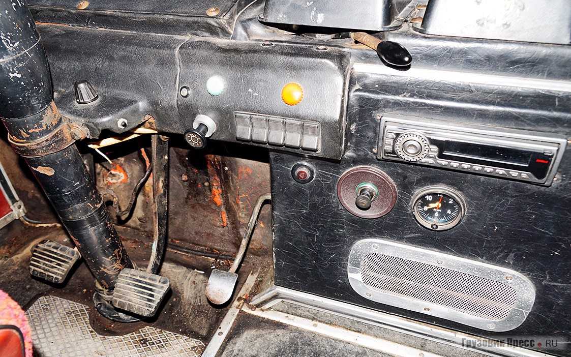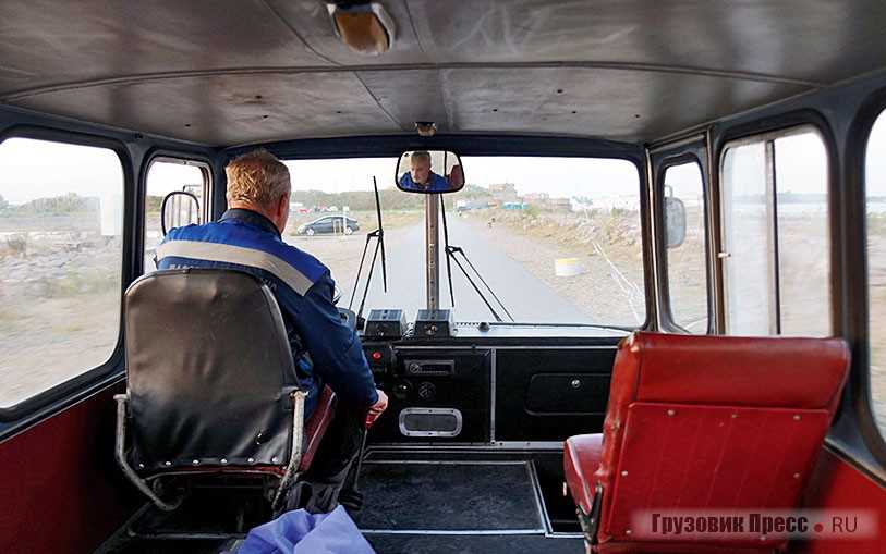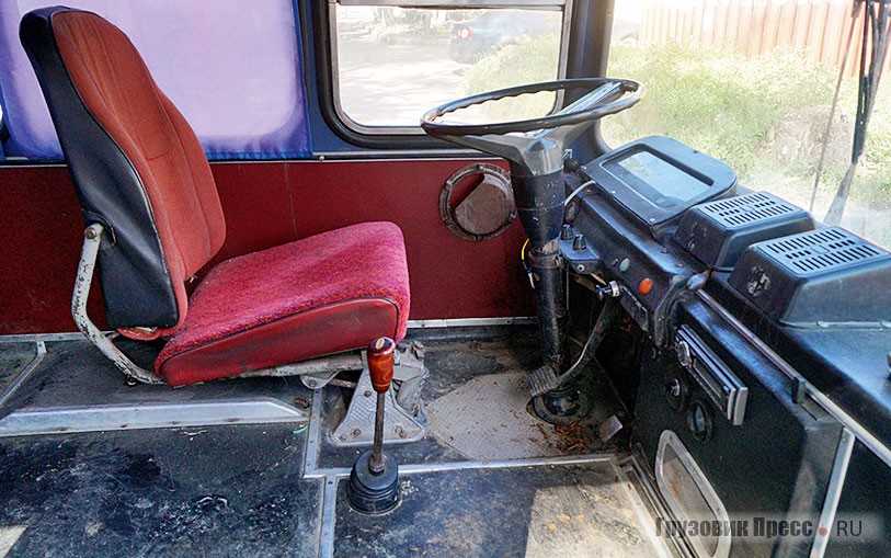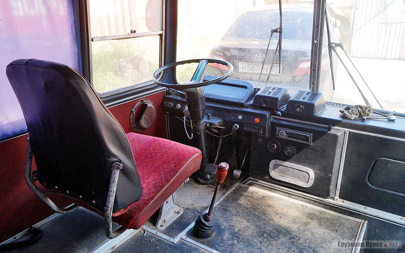 На месте водителя достаточно уютно, но судя по вертикально стоящей рулевой колонке очевидно, что автор старался максимально «упаковать» место водителя в ограниченные габариты машины. Рычаг механической коробки передач «растёт» из пола и достаточно удобно лежит в руке – здесь не требуется, как на РАФе, переключать передачи где-то за спиной. Комбинация приборов и сиденье водителя взяты от автобуса ПАЗ-672, руль – от «24-й» «Волги». В качестве бокса для мелочей служит корзина «для использованных билетов» от ЛиАЗ-677, а кран стояночного тормоза взят у настоящего «Икаруса». Ещё на приборной панели «упаковались» простенькая магнитола, часы от вазовской «шестёрки», прикуриватель и блоки кнопок и переключателей.